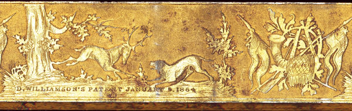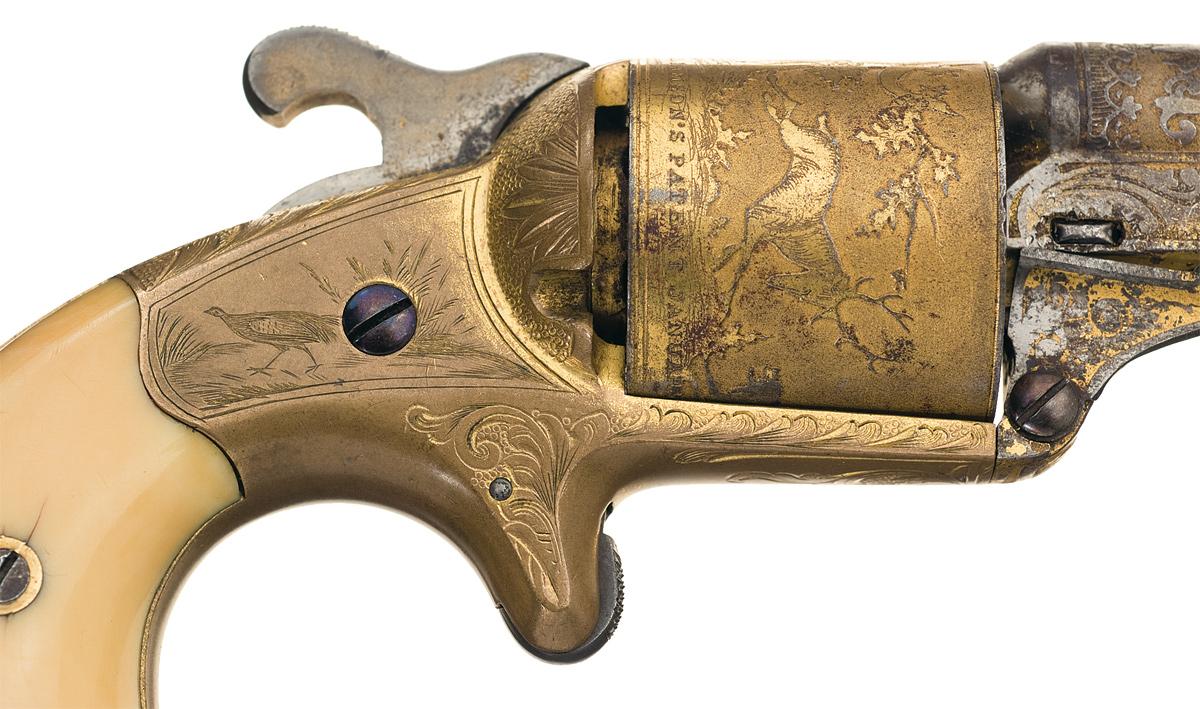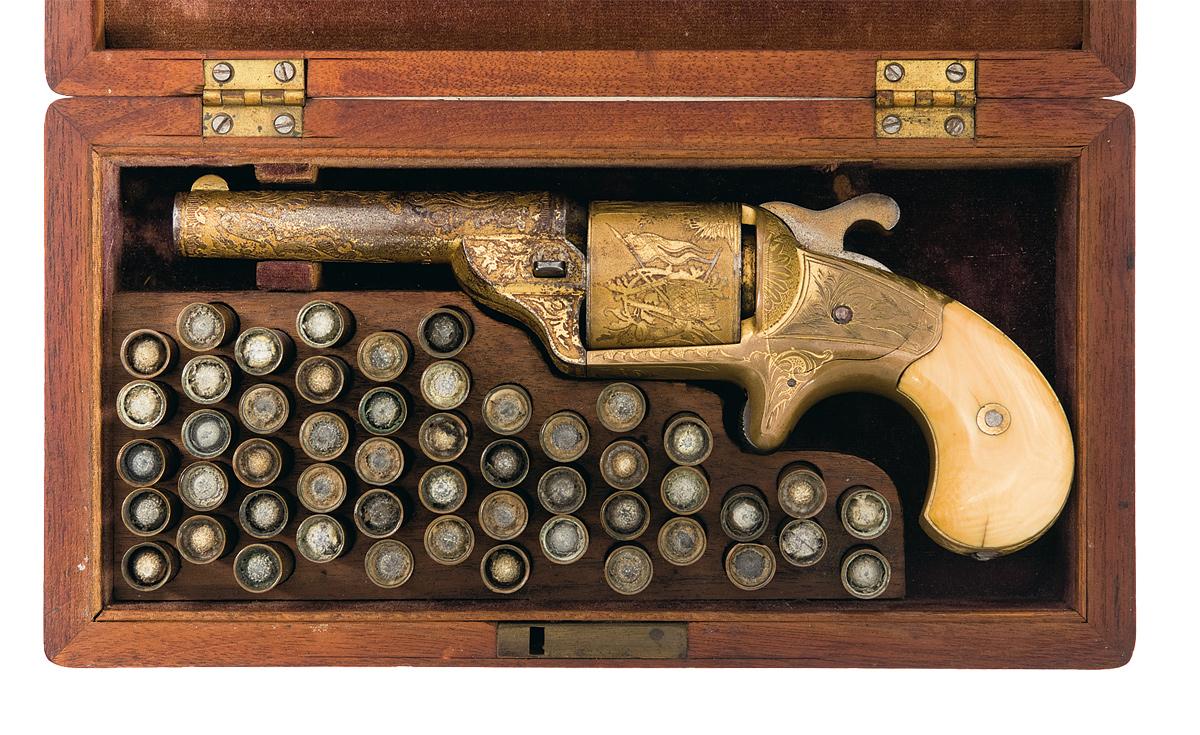 Made from 1864 to 1870, the majority of Moore's revolvers were finished in blue and silver, with an unknown smaller number done in full gold. Blade front and hammer notch rear sights, with the barrel marked "MOORE'S PAT FIREARMS Co, BROOKLYN, N.Y." in a panel and the cylinder "D. WILLIAMSON'S PATENT JANUARY 5, 1864" near the rear face. Acid etched scroll and leaf designs are present on the barrel, with punch dot backed scroll engraving on the frame, scenes of birds in the field on the sides of the frame, floral bursts on the recoil shield and a stand of flags and woodland scene of a dog facing off against a buck on the cylinder, done in a combination of etching and engraving. Checkered hammer and trigger, with smooth ivory bird head grips. Matching numbers on the barrel and grips, with "DC19" on the frame under the left grip. In a purple velvet lined hardwood case with a full 50-round cartridge block.