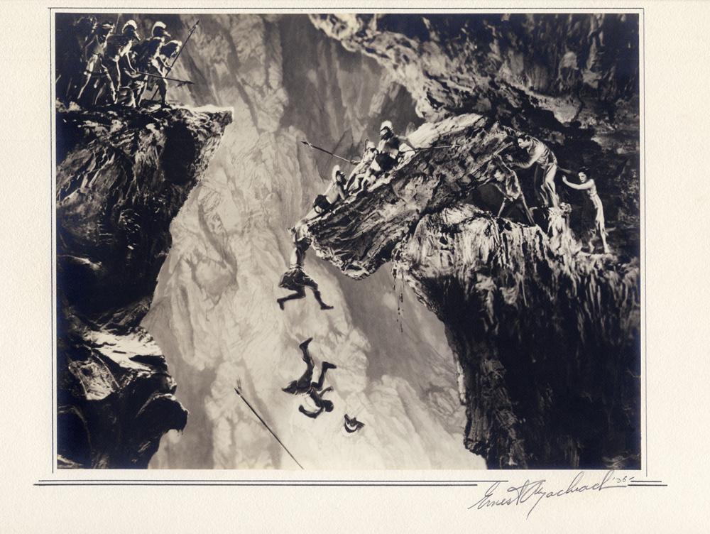 (RKO, 1935) Gelatin silver matte borderless double-weight 15 x 20 in. (image size 10 ½ x 13 ¼ in.) exhibition print (custom mounted onto 4-ply textured mount board) of the Kingdom of Kor warriors falling from a cliff as Randolph Scott, Helen Mack, and Nigel Bruce look on. Hand-printed by the photographer and specially mounted for exhibition, and signed “Ernest A Bachrach ‘35/” on mount recto lower right. Print is excellent, with very minor toning to mount.