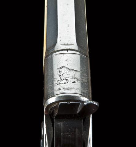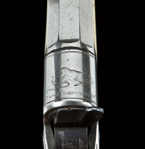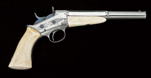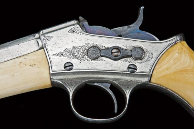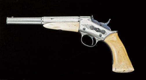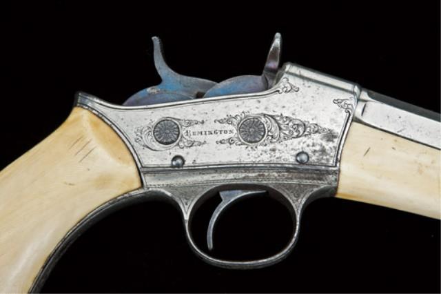 Exhibition quality Remington Rolling Block pistol, .50 caliber cannon barrel, bank-note style scroll engraved, nickel plated, ivory grips. Shows Remington on right side of frame between pins. With engraved breech, portraying lion holding down snake. Serial #124, formerly of the William Locke collection, illustrated page 237, Remington Rolling Block Pistols by Jerry Landskron. From the author’s collection. The pistol shows 90-95% original nickel just starting to crack and peel slightly with some losses at the edges, muzzle, and straps. Areas where the finish has lifted has gone to a patina with some darkening and pinprick pitting just starting, but absolutely no polishing or cleaning. The hammer and rolling block show most of their bright original blue. The bore is bright, the edges crisp, the ivory grips show a great patina with some checking and aging, small losses, and are absolutely genuine to the period. Ivory stock cannon barrel Rolling Blocks are generally considered to be made for expositions and presentations. The engraving on breech may have some significance as to the English lion holding down an opponent. A very important and key Remington and one of the stars of the Jerry