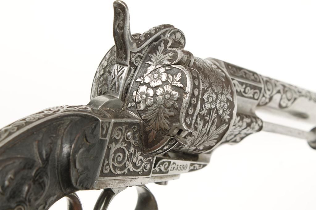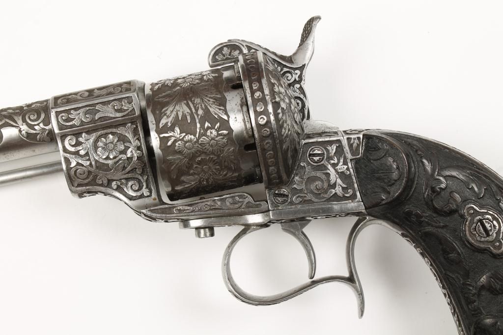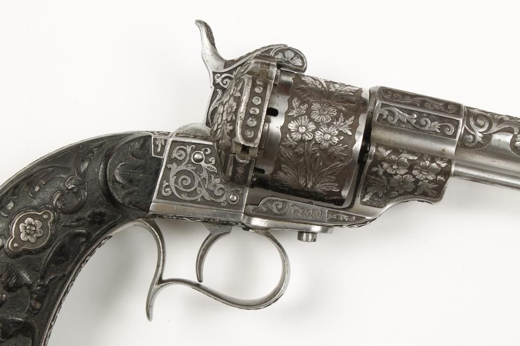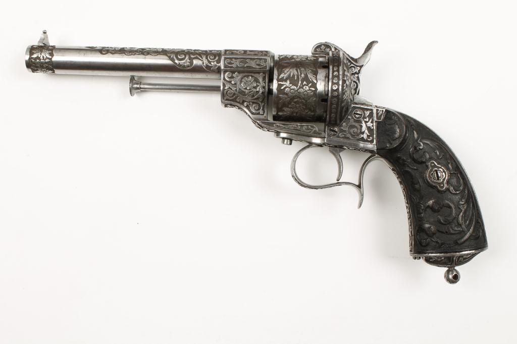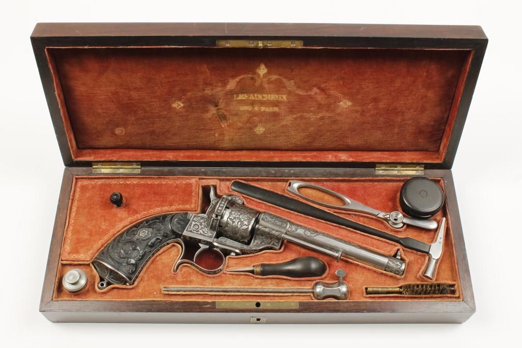 Exhibition quality deep relief scroll engraved and chiseled single action pin fire pistol by Lefaucheux of Paris with original bright metal or satin finish with raised carved ebony grips and in its original French style fitted Rosewood case. This 11 mm single action pin fire shows a 6 shot cylinder and measures 12 ½” overall with 6 ¼” barrel. The barrel is signed in deep relief engraved and chiseled letters surrounded byfine florals and decorative scroll motifs. The grip is carved ebony in a matching floral design to the embellishment on the pistol. The condition is fine to excellent with very sharp surfaces and crisp edges. The rightside of the frame shows an L F proof and the number 3550 with the front of the frame showing a number 1. The fitted case is in very good plus to near fine condition with some slight fading and gold embossed makersname in lid. The case contains mold and tools along with a small quantity of pin fire shells. The exterior of the case is veneered Rosewood with brass furniture and remains in very good plus to near fine condition. The