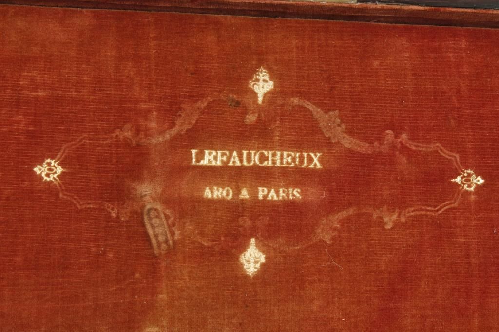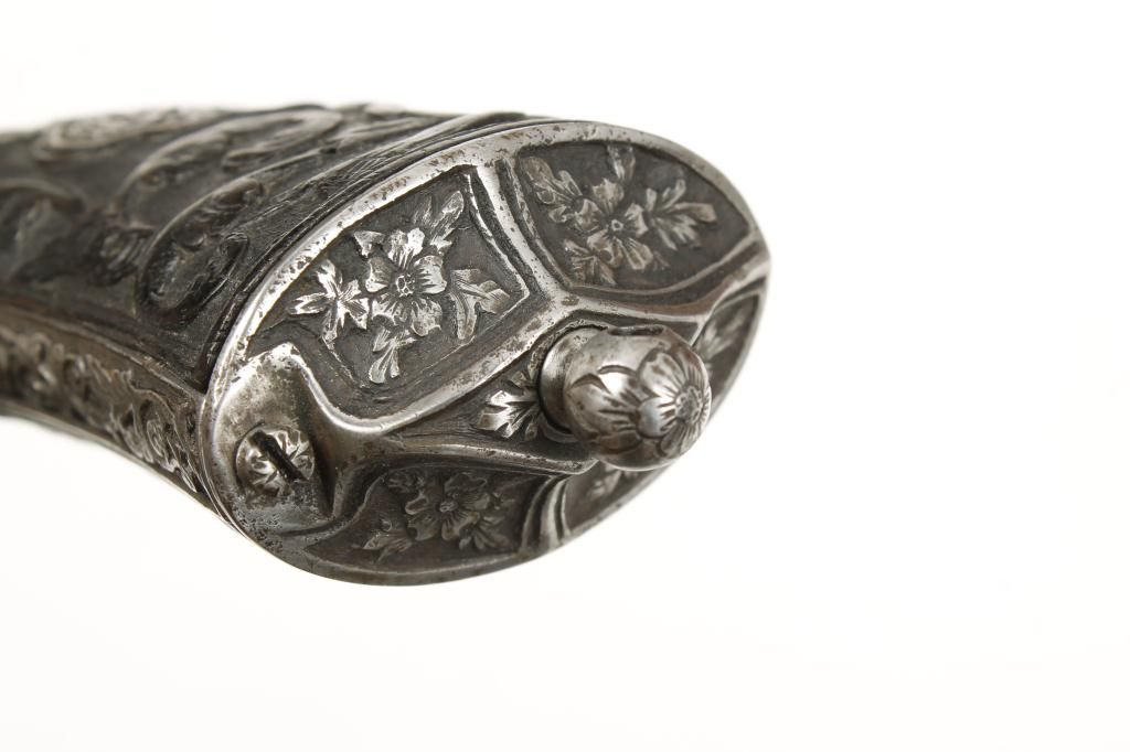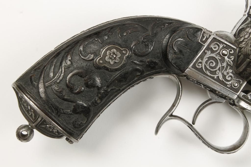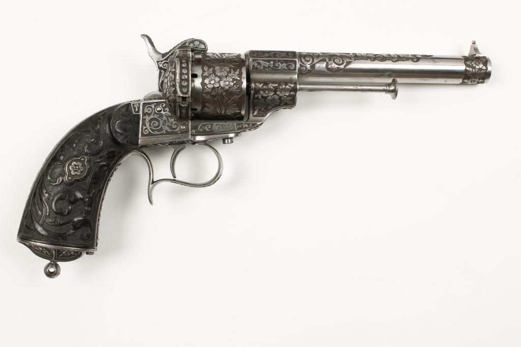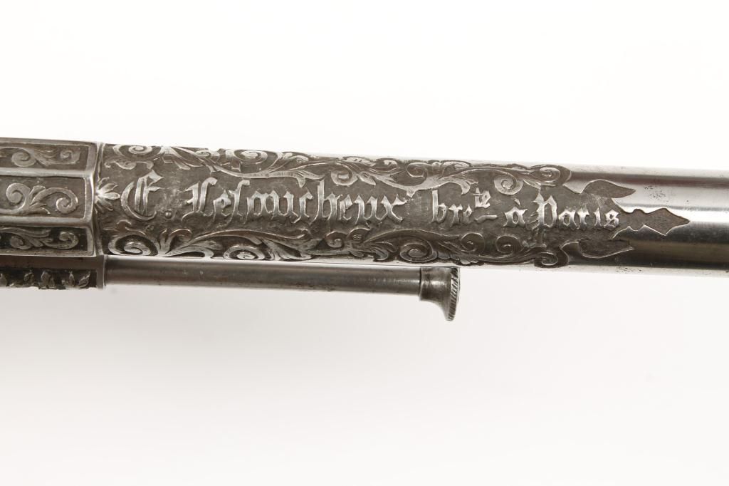 Exhibition quality deep relief scroll engraved and chiseled single action pin fire pistol by Lefaucheux of Paris with original bright metal or satin finish with raised carved ebony grips and in its original French style fitted Rosewood case. This 11 mm single action pin fire shows a 6 shot cylinder and measures 12 ½” overall with 6 ¼” barrel. The barrel is signed in deep relief engraved and chiseled letters surrounded byfine florals and decorative scroll motifs. The grip is carved ebony in a matching floral design to the embellishment on the pistol. The condition is fine to excellent with very sharp surfaces and crisp edges. The rightside of the frame shows an L F proof and the number 3550 with the front of the frame showing a number 1. The fitted case is in very good plus to near fine condition with some slight fading and gold embossed makersname in lid. The case contains mold and tools along with a small quantity of pin fire shells. The exterior of the case is veneered Rosewood with brass furniture and remains in very good plus to near fine condition. The