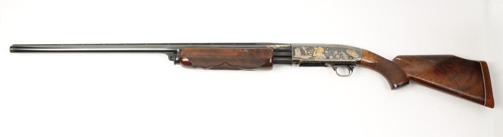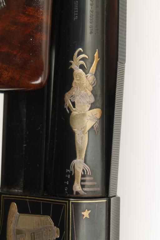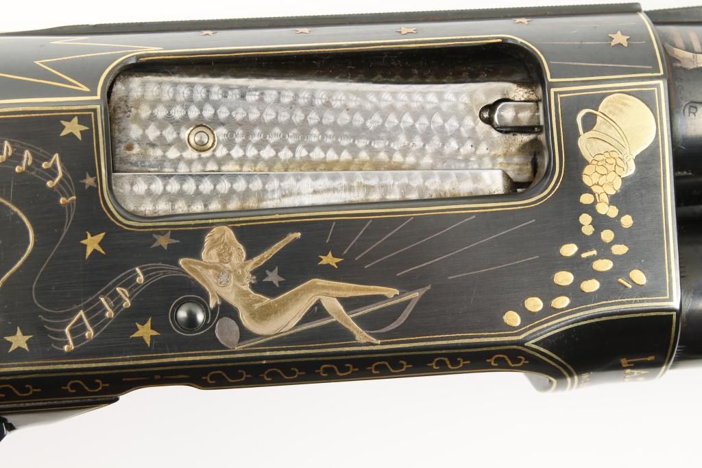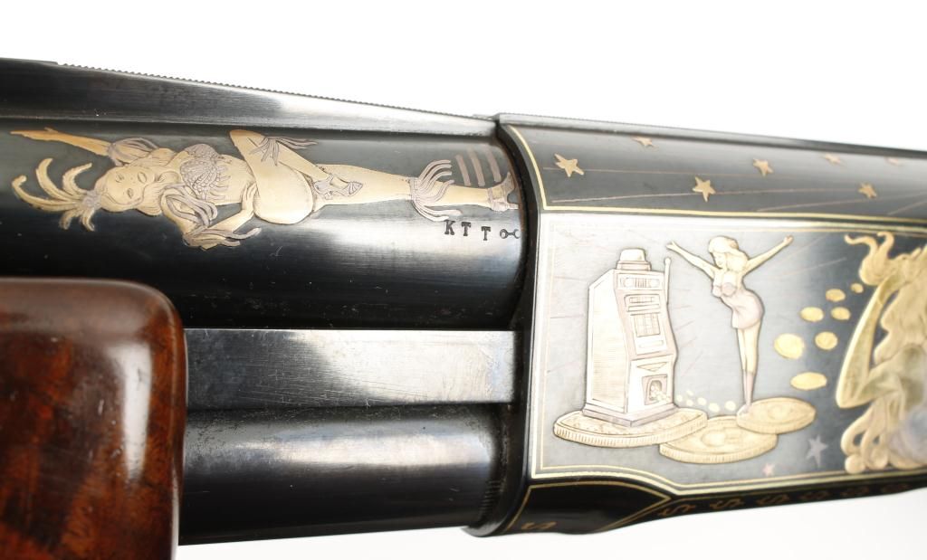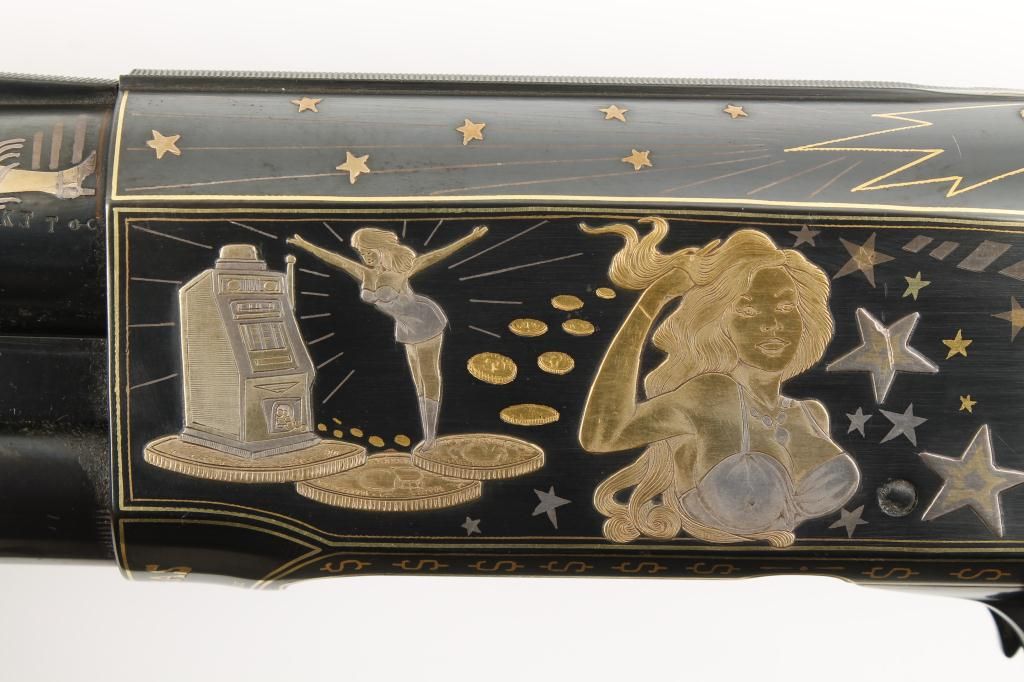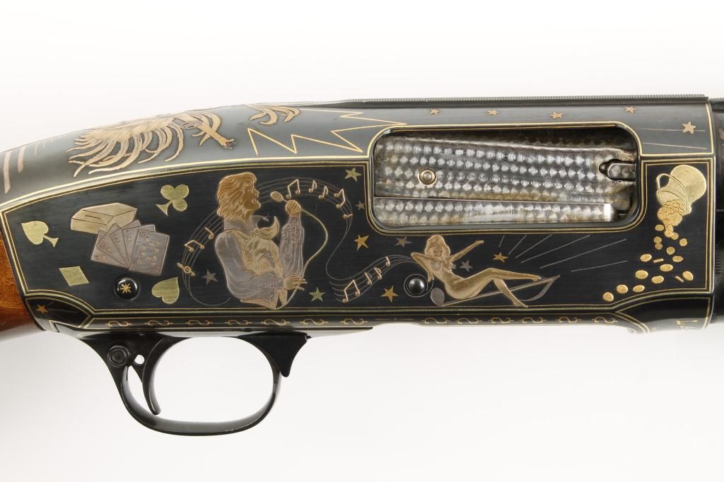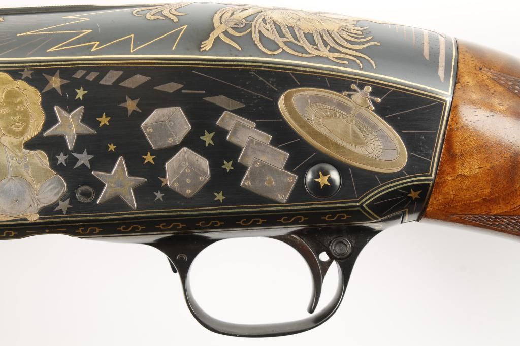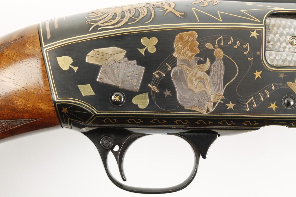 Exhibition quality, multi-colored, gold-inlaid, Remington Model 31 pump action made for international singing star Wayne Newton, affectionately known as Mr. Las Vegas, serial #99885. This gun is 12GA with30” barrel showing ventilated rib. The gold inlay was accomplished on special order by Angelo Bee and Cargnel. The gun is stocked in finest quality burl walnut in fancy patterns showing a high rise trap style cheek piecewith elongated pistol grip. The left side of the gun shows portraits of showgirls, slot machine hitting jackpot, stars, dice, cards, and roulette wheel. The inlays are of finest quality and are in multi-color gold. The topof the receiver shows a showgirl in full regalia with lightning and star accents. The right side of the receiver shows Newton in costume singing, nude lady with pasties, cards, musical notes, stars, and a bucket ofgold pouring out. The gun is bordered in dollar signs and the bottom of the receiver shows words “Las Vegas”, the serial number, and the three artist’s signature. The barrel shows opposing showgirl on each side of the