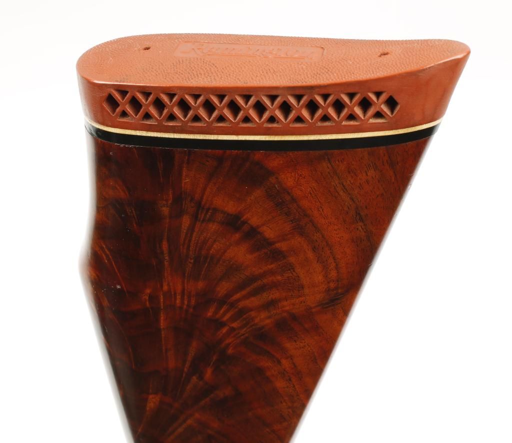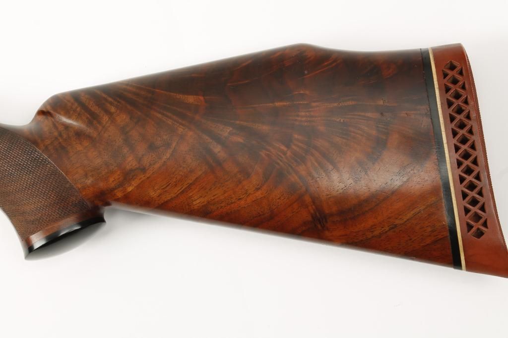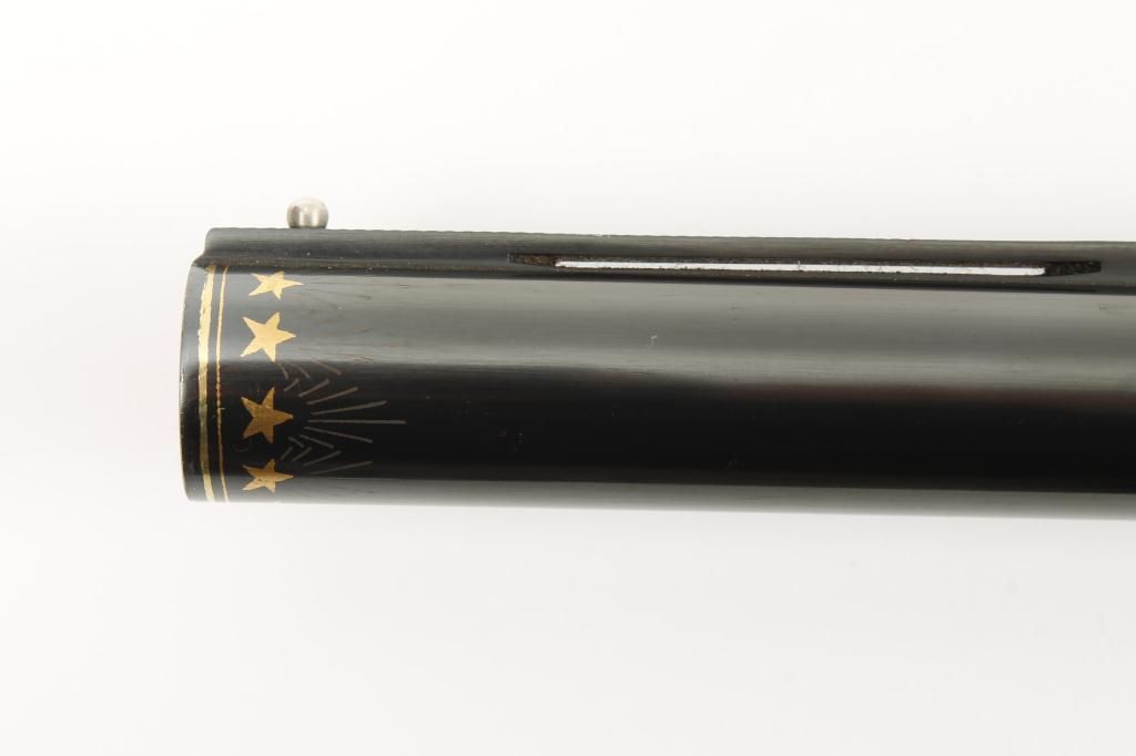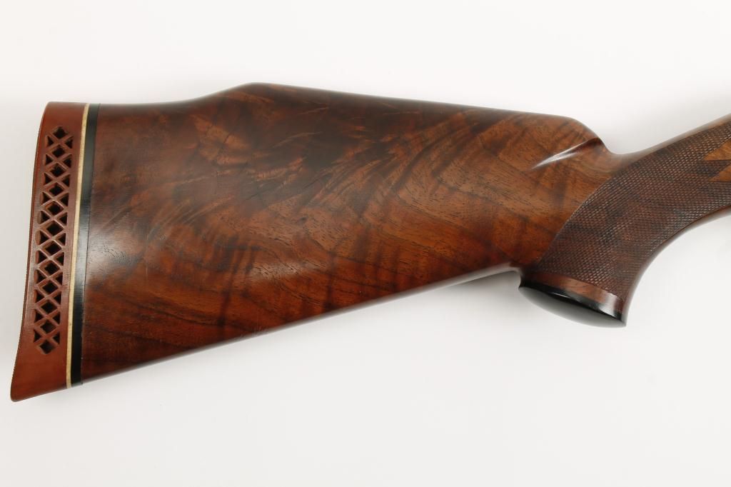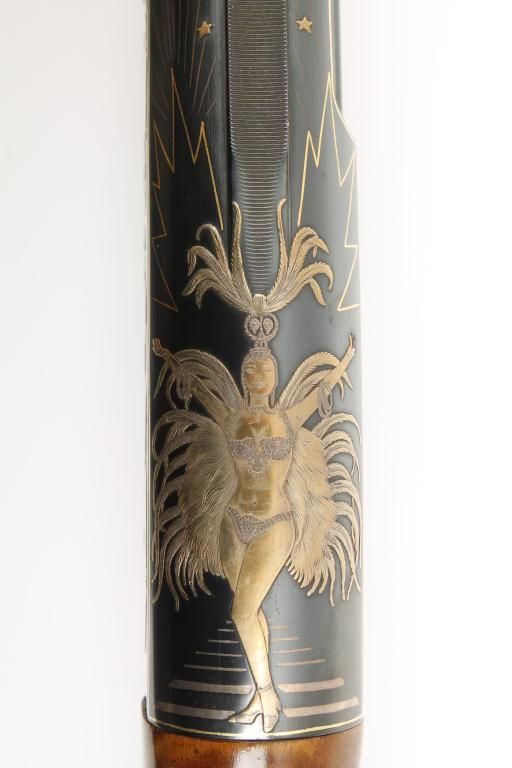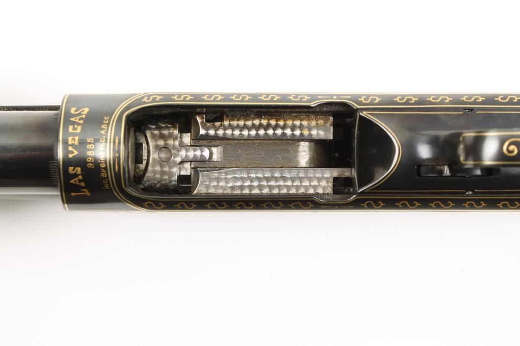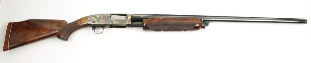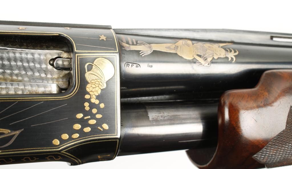 Exhibition quality, multi-colored, gold-inlaid, Remington Model 31 pump action made for international singing star Wayne Newton, affectionately known as Mr. Las Vegas, serial #99885. This gun is 12GA with30” barrel showing ventilated rib. The gold inlay was accomplished on special order by Angelo Bee and Cargnel. The gun is stocked in finest quality burl walnut in fancy patterns showing a high rise trap style cheek piecewith elongated pistol grip. The left side of the gun shows portraits of showgirls, slot machine hitting jackpot, stars, dice, cards, and roulette wheel. The inlays are of finest quality and are in multi-color gold. The topof the receiver shows a showgirl in full regalia with lightning and star accents. The right side of the receiver shows Newton in costume singing, nude lady with pasties, cards, musical notes, stars, and a bucket ofgold pouring out. The gun is bordered in dollar signs and the bottom of the receiver shows words “Las Vegas”, the serial number, and the three artist’s signature. The barrel shows opposing showgirl on each side of the