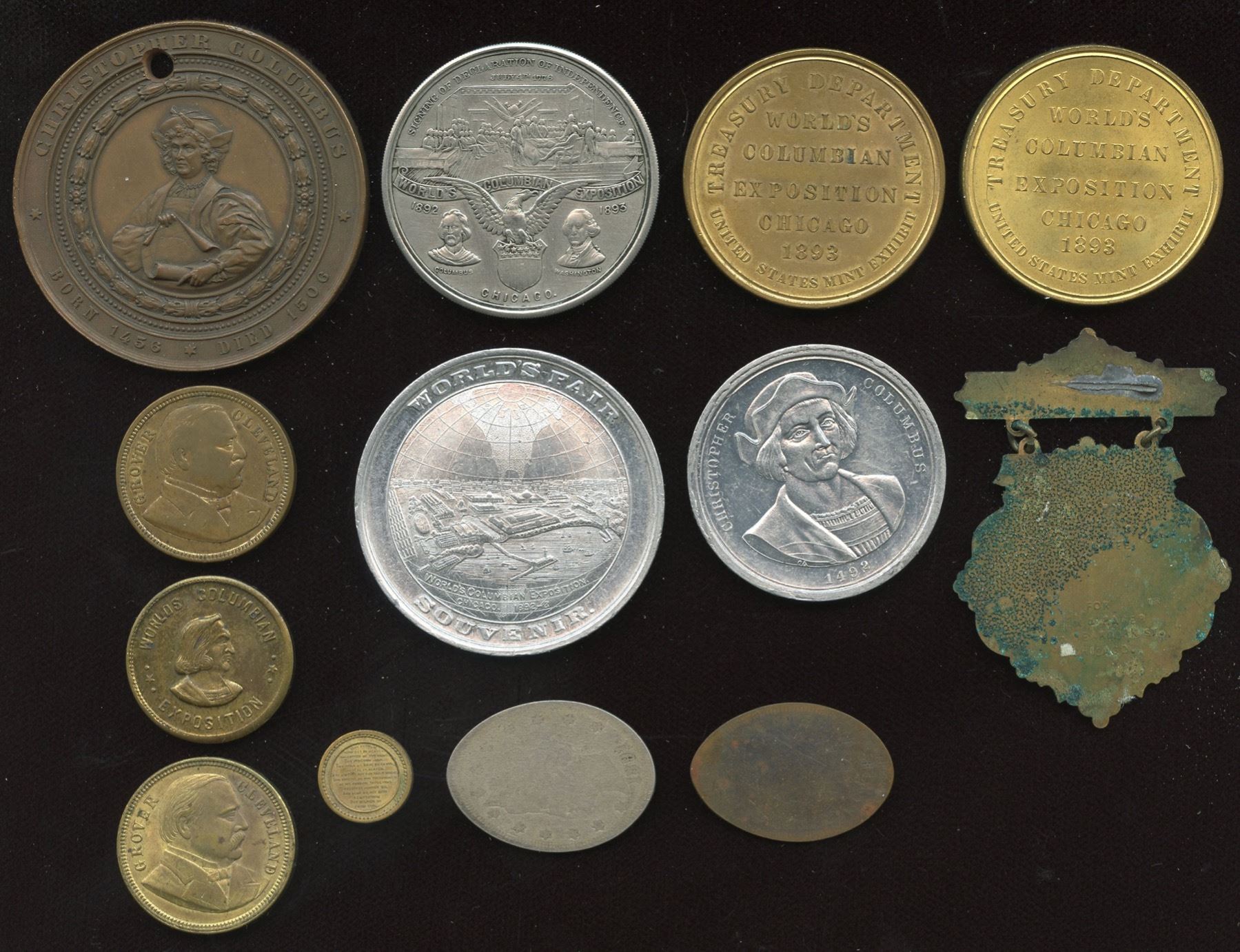 Visit of President Cleveland to the 1893 Chicago Ex., brass, 25 mm 2 Pcs; 1893 brass specimen struck in the Canadian Court, Chicago Ex, 23 mm; brass; Canada souvenir, Chicago Ex, 1893, uniface on 2 hangers; 1893 Chicago Ex, Treasury Department, brass, 2 Pcs.; Souvenir, World's Fair, Chicago, holed at top, bronze, 50 mm, bust of Columbus; 1893 elongated specimens, one white metal the other bronze; Souvenir 1893 Fair, aluminum, 49mm; 1893 aluminum piece, bust of Columbus, 37 mm; Signing of Independence, Columbus and Washington, 1893, landing of the Pilgrims, white metal, 40 mm; a brass Lord's Prayer with bust of Columbus on the reverse, 8 mm. 13 Pcs.