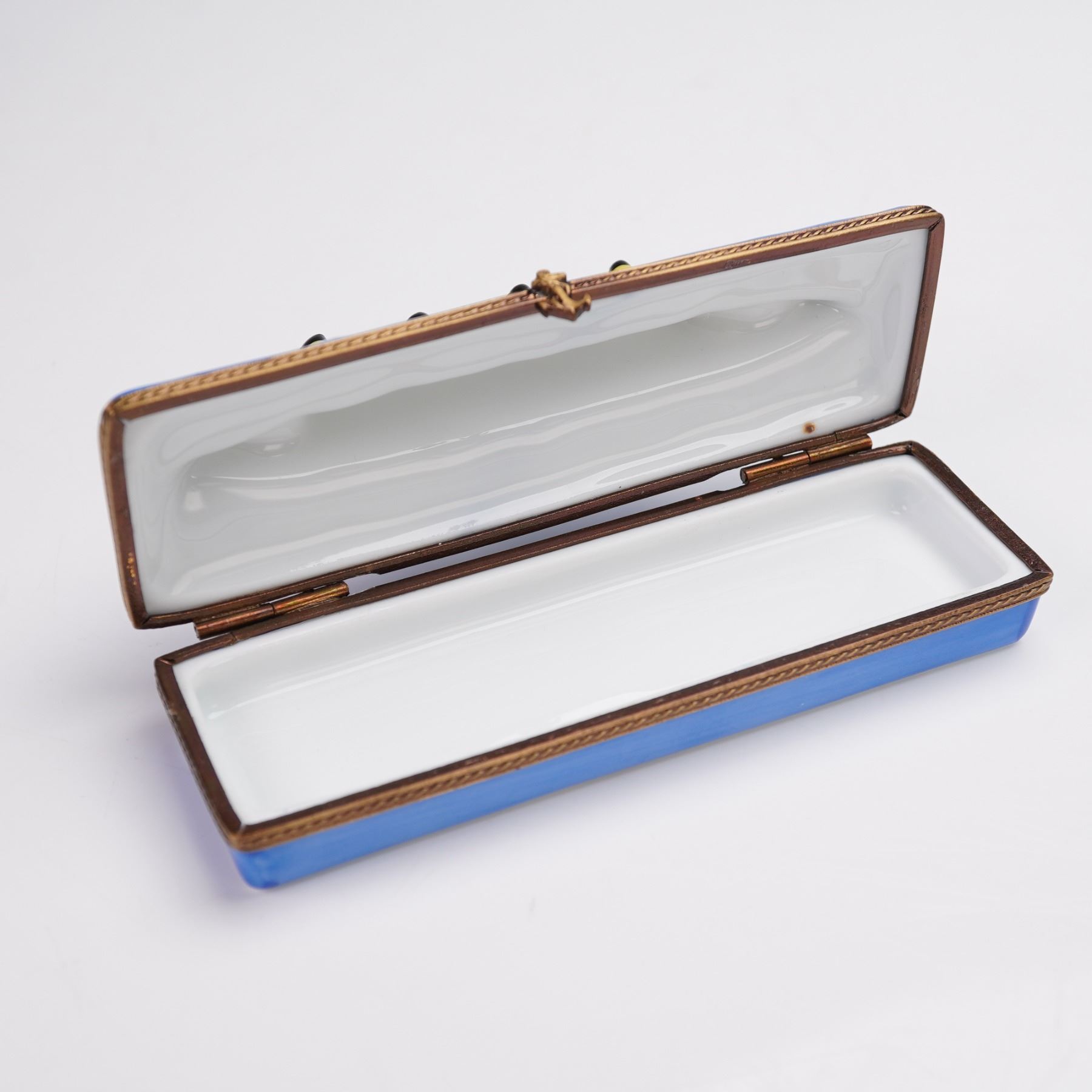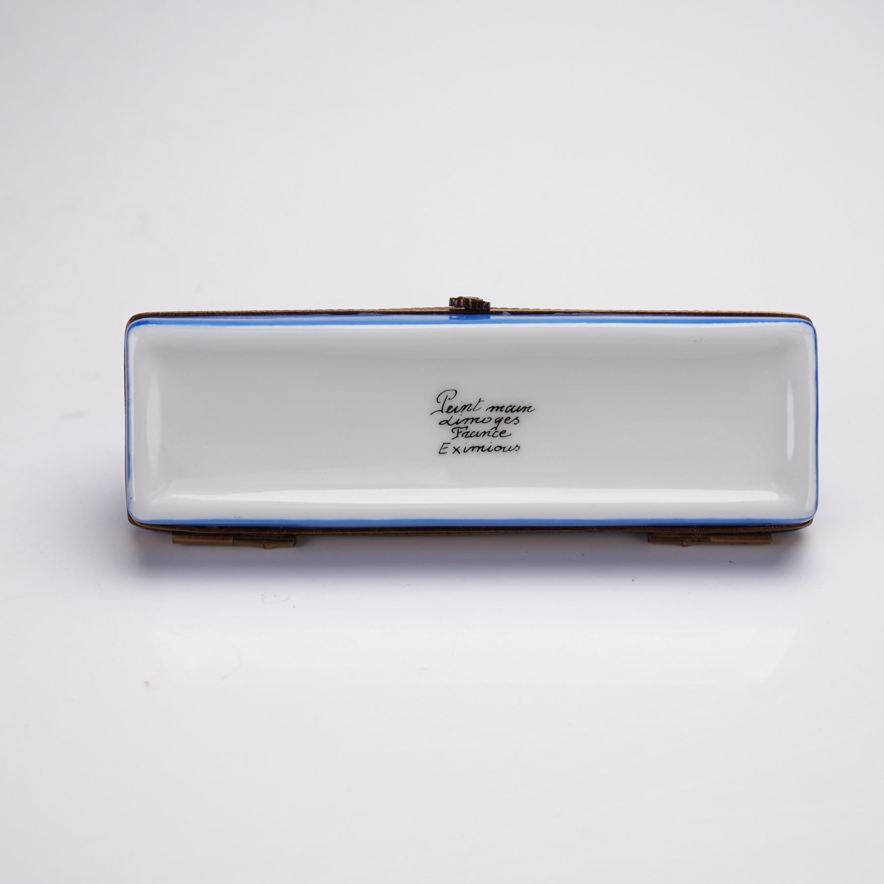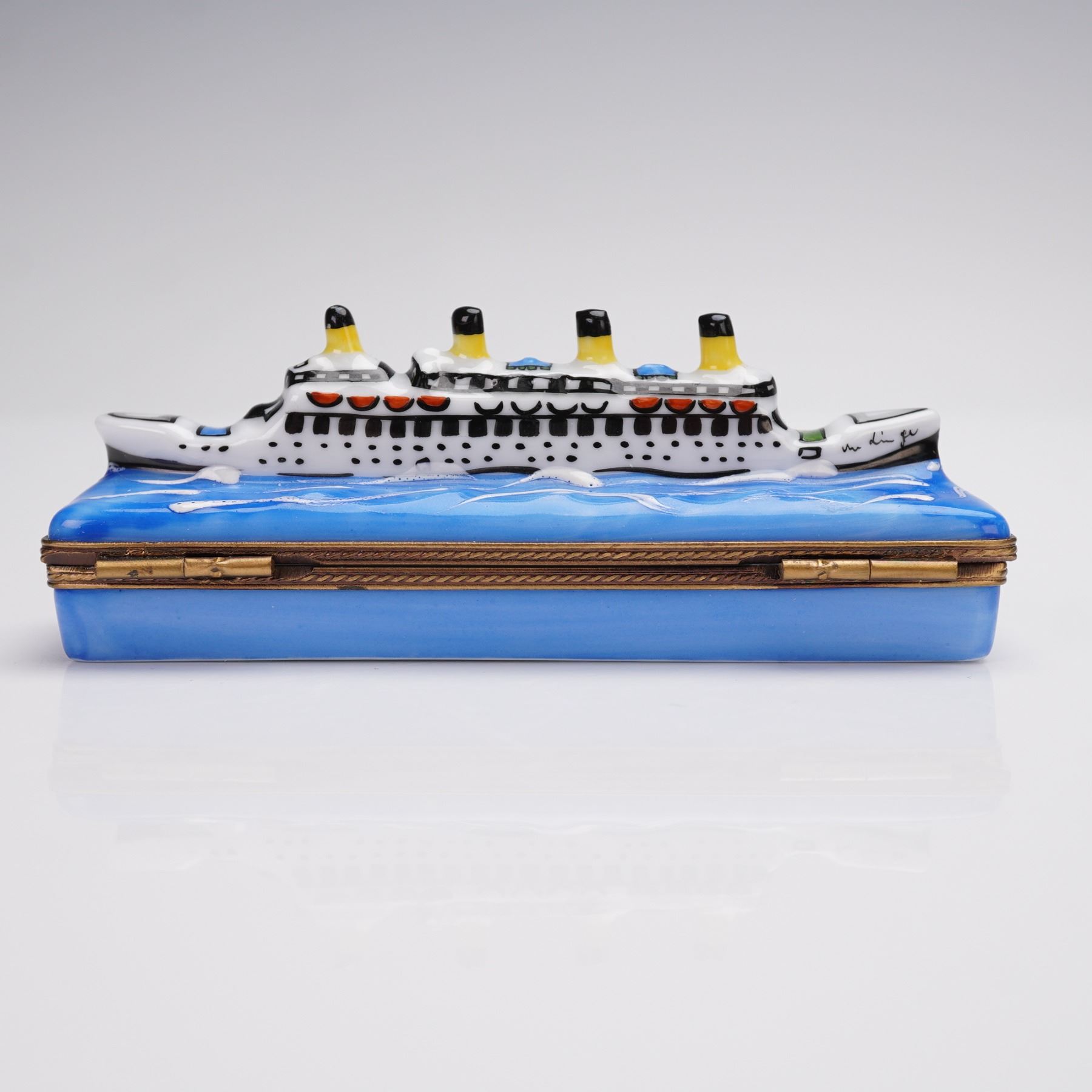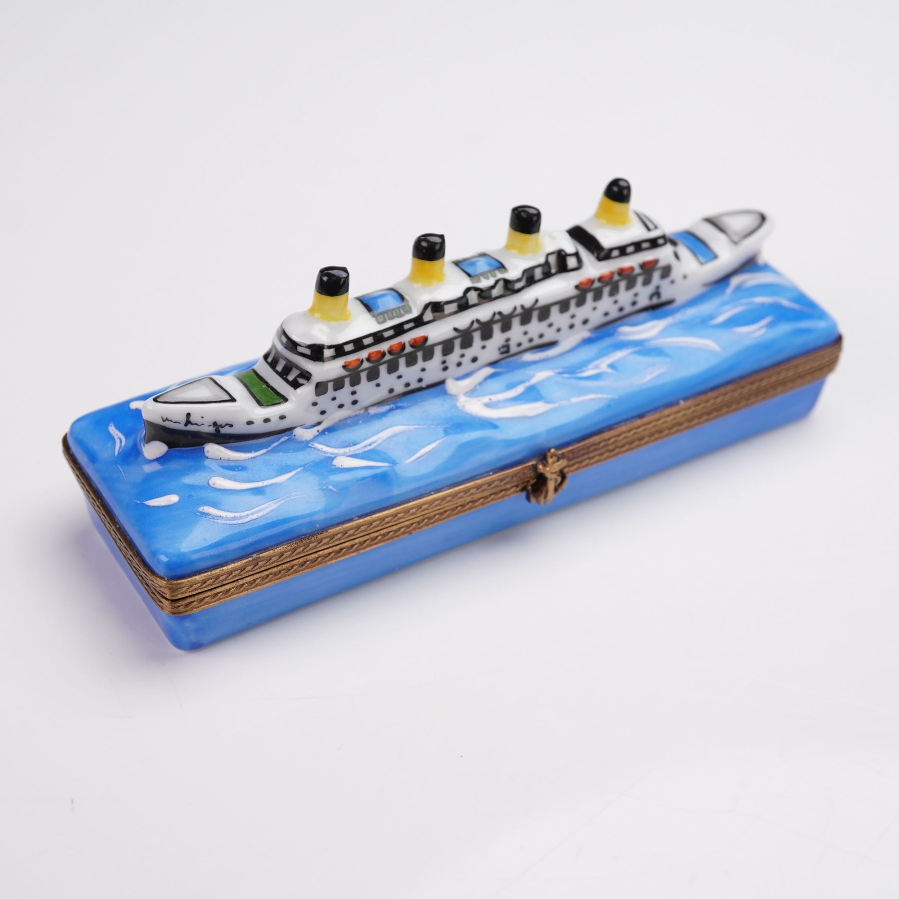 Porcelain box featuring a detailed cruise ship motif atop a rectangular base painted to resemble ocean waves. The exterior is accented with a brass clasp in the shape of an anchor, adding a nautical detail to the functional design. The hinged box opens to reveal a smooth white interior, with the underside marked Peint Main Limoges France Eximious.