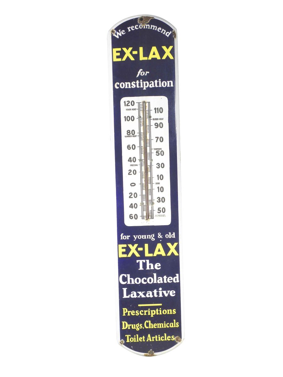 Exlax Porcelain Thermometer, patent 1915. Chips at grommet, discoloration throughout and perimeter rust otherwise good condition. 8 X 39 inches.