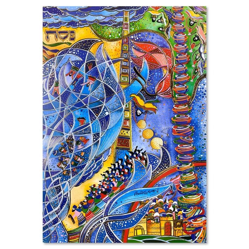 "Exodus I" is a limited edition serigraph with gold foil on paper by Rafael Abecassis. The piece comes hand signed by the artist, numbered, and with a letter of authenticity. Measures approximately 13" x 9".