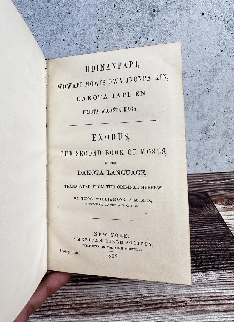 Hdinanpapi, Wowapi Mowis Owa Inonpa Kin, Dakota Iapi En Pejuta Wicasta Kaga. Exodus, the Second Book of Moses in the Dakota Language. Translated from the original Hebrew by Thomas Williamson, 1869. Hard to find copy of two books of the bible translated into The Dakota language. Thomas Williamson was a medical doctor who arrived in Minnesota in 1835. Along with caring for a multitude of Dakota and white patients, he, along with John Renville, Stephen Riggs and Gideon and Samuel Pond, helped create the first written alphabet and grammar of the Dakota language.