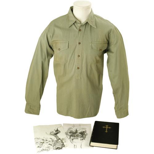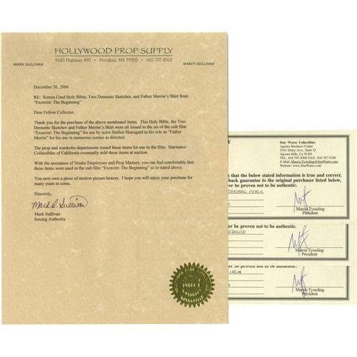 <B>"Exorcist: The Beginning" Costume Shirt, Prop Bible, and Sketches.</B></I> Includes a corduroy shirt worn by Stellan Skarsgård in the 2004 prequel, a prop Bible, and two demon design sketches from the production, all in overall Excellent condition. Also included is a DVD copy of the movie. <I>Accompanied by LOA from Hollywood Prop Supply.</B></I><BR><BR><b>Shipping:</b> Clothing, Costumes & Jerseys (<a target="_blank" href="http://www.heritageauctions.com/common/shipping.php">view shipping information</a>)
