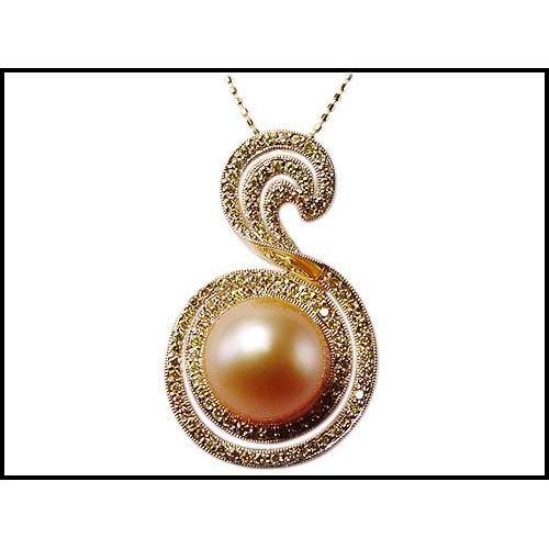 This luxurious 18k yellow gold diamond and Pearl pendant contains 110 diamonds and one yellow/gold pearl at 11mm (7/16") around. This pendant measures pendant 20mm (3/4") at widest x 32mm (1 1/4") long. This piece will stand out against the ordinary and will become a definite attraction.
