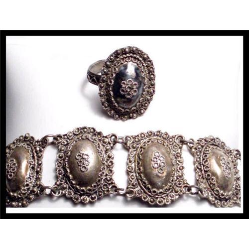This is such a detailed piece that it looks more like a piece of art than a jewelry set. The bracelet is hollow with silver backing and the front is so exquisite that you can see that it took a real artisan to make this. The work involved is tremendous. The bracelet is 6 3/4" long and 7/8" wide. IT has a pin closure. THe ring is a size 6 1/2 and the setting is 7/8" long. The ring has ornate etching all the way around the band. The bracelet has no enameling on it, but the ring does. Probably the ring was never worn and the bracelet was. The bracelet has a few dings. This is some sort of European silver, most likely 800.