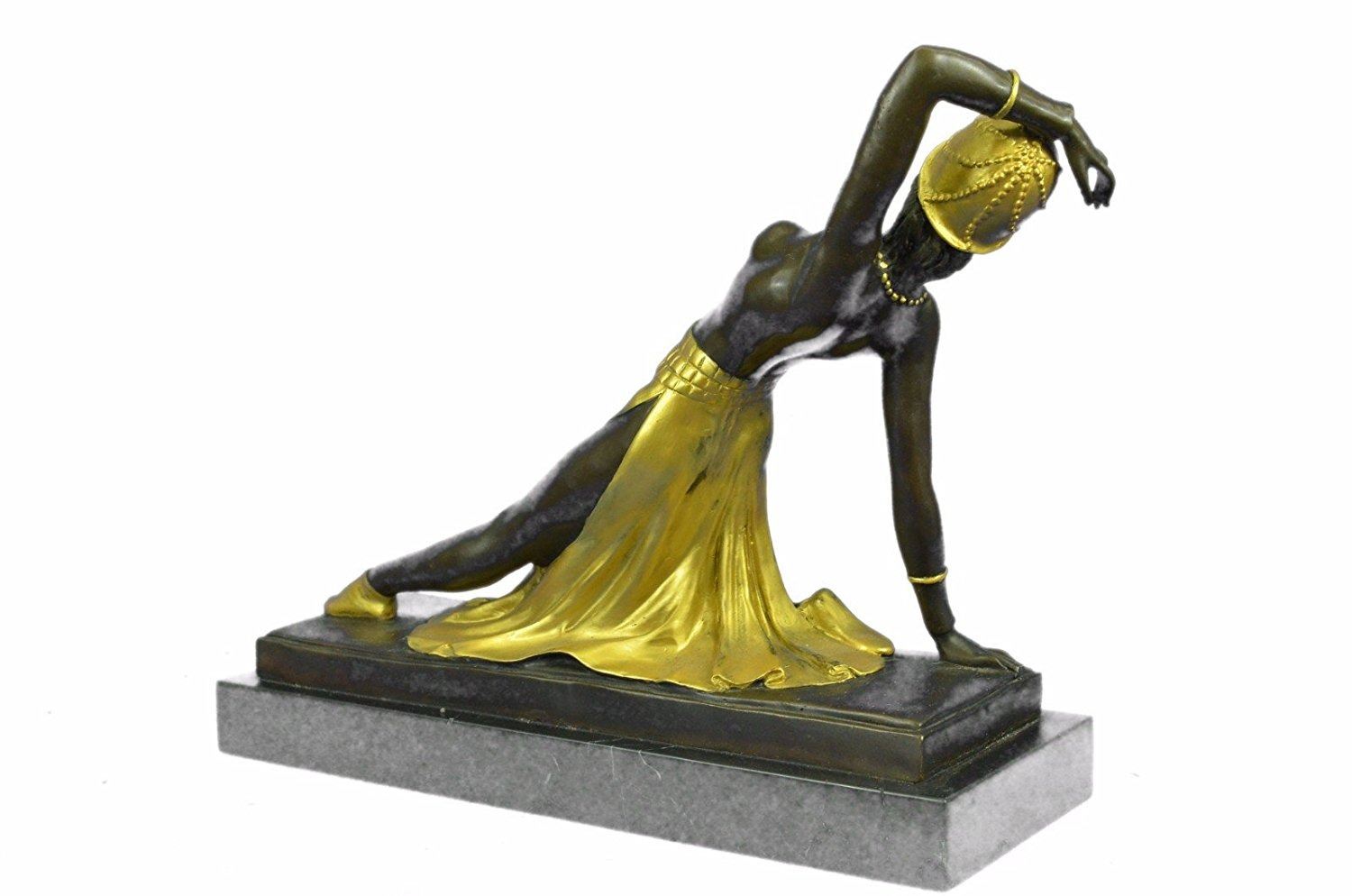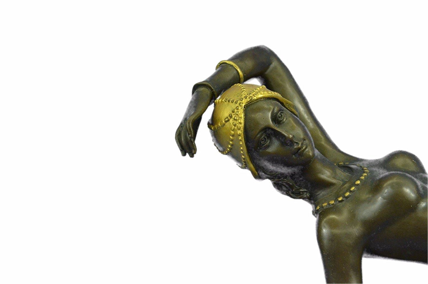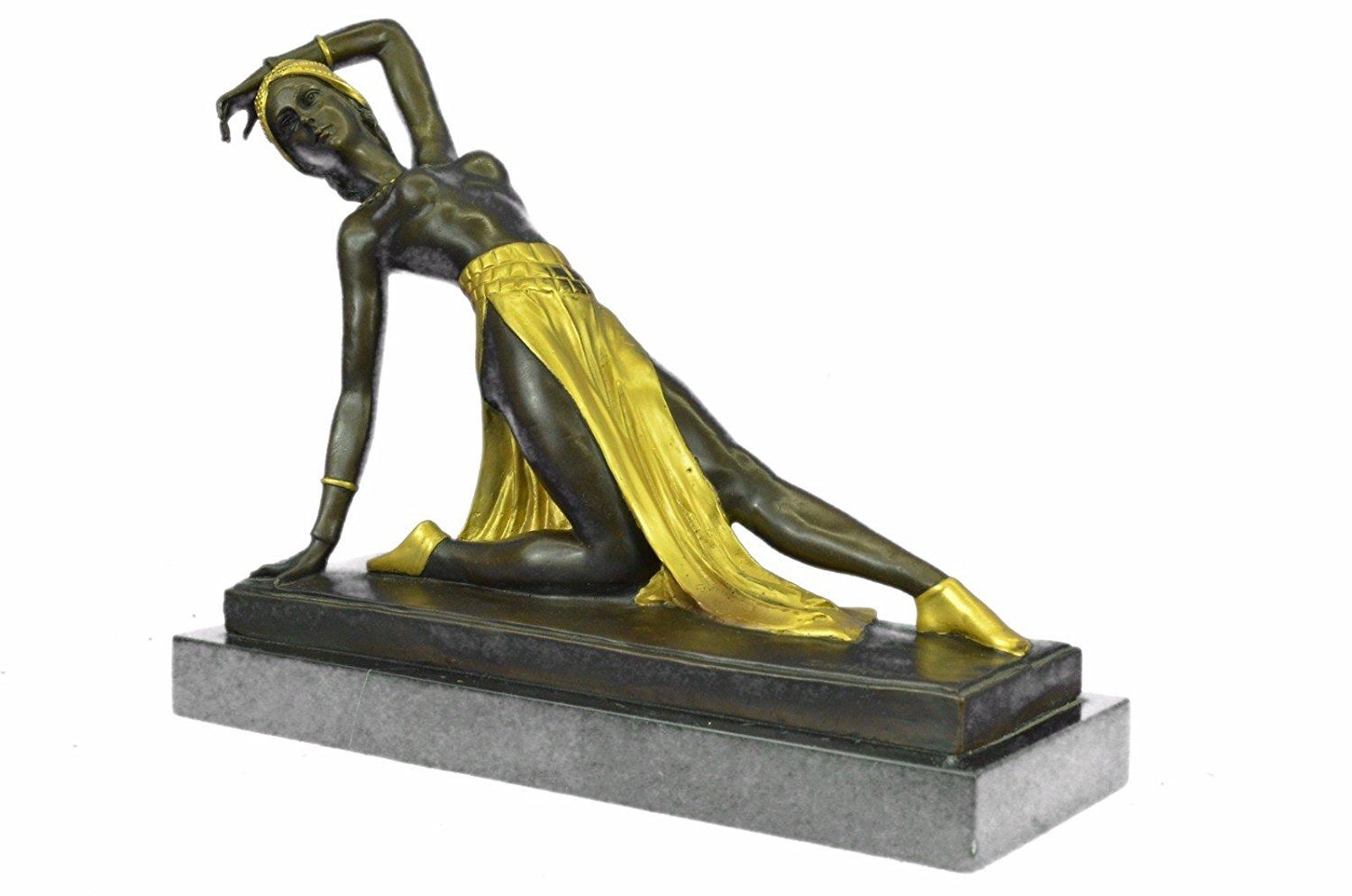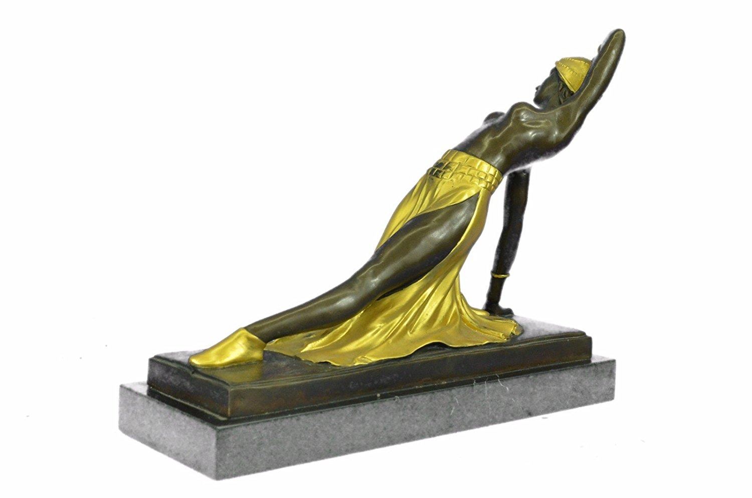 This beautiful bronze sculpture is known as The Exotic Dancer. She leans back using her one arm to support her as her other arm gracefully falls back around her head. By extending her arm and leg it elongates her body and opens her bodice to give the sculpture more dimensions. She wears a leotard which is skin tight against her upper body and her skirt has slights exposing her thighs. Her gold belt is thick and accentuates her waist as it rests against her red dress. She has gold beads that string across her neck and she wears gold bangles on her wrists. She wears a headpiece that matches her ensemble and is adorned with intricate gold beads. This bronze sculpture portrays the flexibility and agility of the ballet dancer beautifully. This sculpture was cast using the Lost Wax Method and has a red, gold and brown patina. This sculpture is handmade and 100% bronze. Bronze Dimensions with Marble Base: Height 10 X Width 16 inches. Weight: 15 LBS. Inventory: 3451B175J43