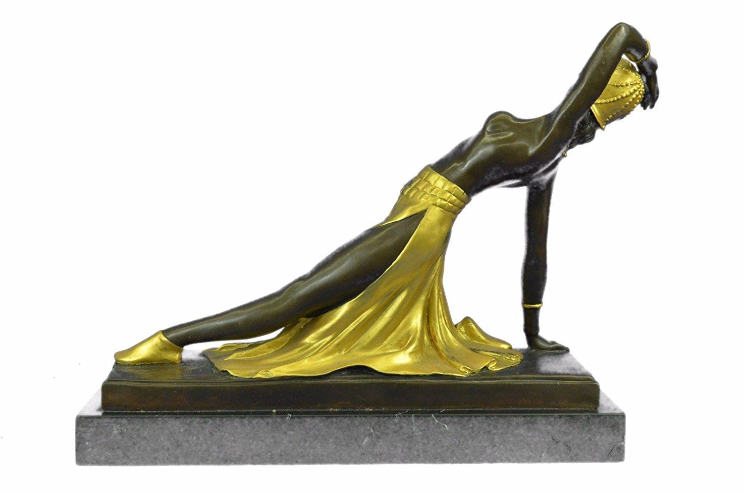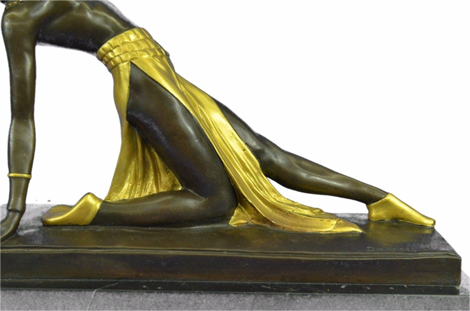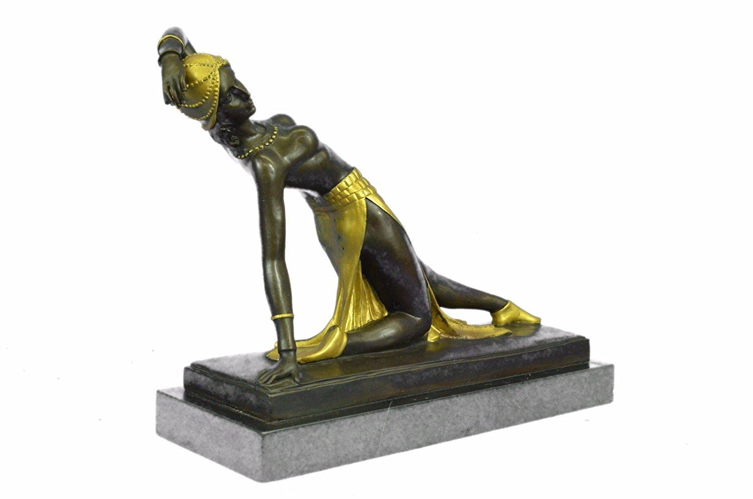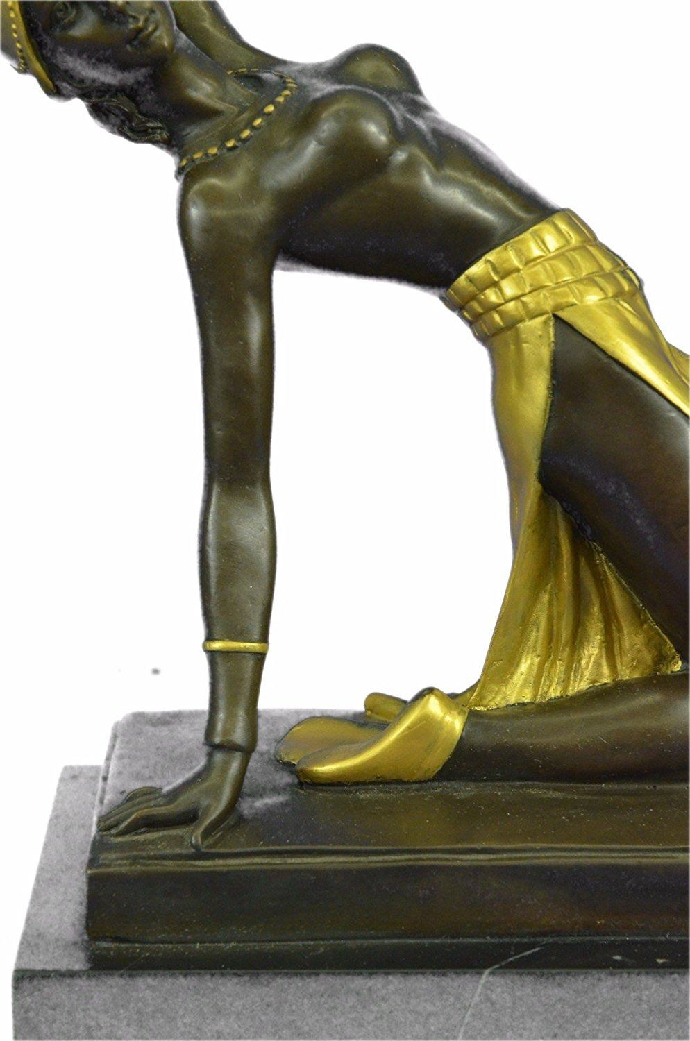 This beautiful bronze sculpture is known as The Exotic Dancer. She leans back using her one arm to support her as her other arm gracefully falls back around her head. By extending her arm and leg it elongates her body and opens her bodice to give the sculpture more dimensions. She wears a leotard which is skin tight against her upper body and her skirt has slights exposing her thighs. Her gold belt is thick and accentuates her waist as it rests against her red dress. She has gold beads that string across her neck and she wears gold bangles on her wrists. She wears a headpiece that matches her ensemble and is adorned with intricate gold beads. This bronze sculpture portrays the flexibility and agility of the ballet dancer beautifully. This sculpture was cast using the Lost Wax Method and has a red, gold and brown patina. This sculpture is handmade and 100% bronze. Bronze Dimensions with Marble Base: Height 10 X Width 16 inches. Weight: 15 LBS. Inventory: 3451B175J43