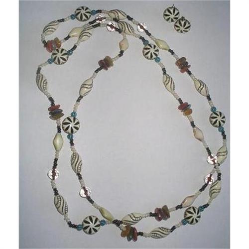 This is definitely a show stopper, very stunning. Small natural stones in colors of light brown, russet, coral and olive green interspersed with small beads of a turquoise and black color,pearl color beads, small jet black beads, clear Multi faceted crystal beads with stunning oval and round off-white beads which have lovely carved markings on them. This is a very long piece, with no closure. The measurement is 46" inches in total with a drop/hang of 23" inches. Could be worn double strand. Very exotic design. The matching earrings are for pierced ears and measure just over 1/4" inch in diameter. A beautiful set.