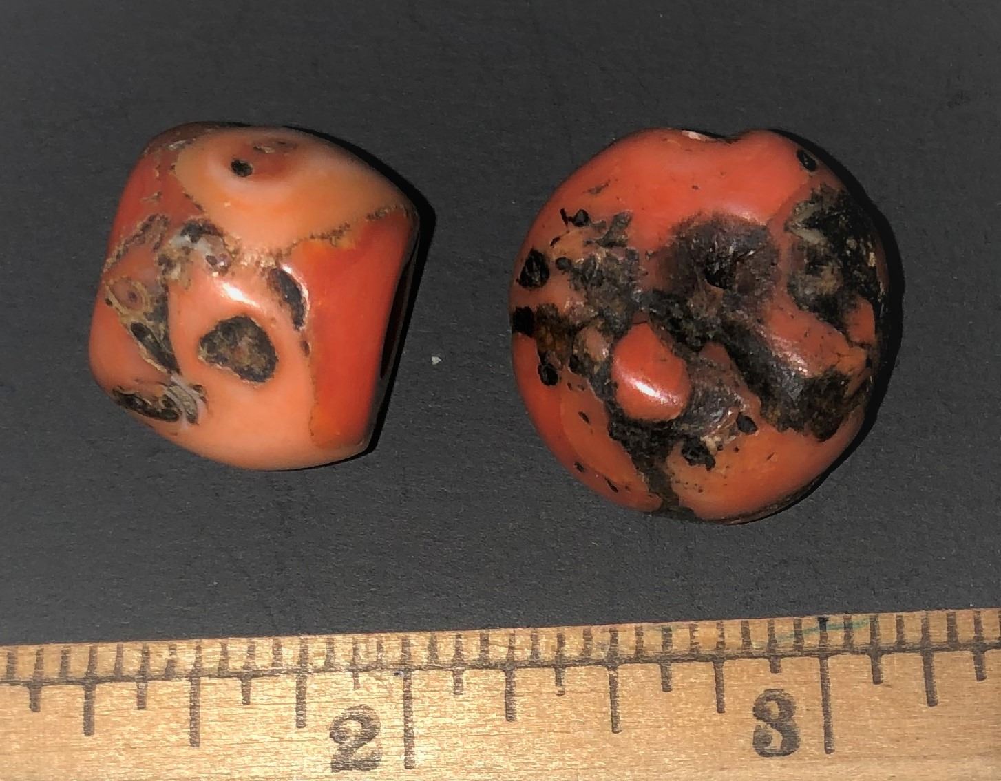 Description: Two rare antique coral beads used in Nepal and Tibet for currency for centuries. See Opitz, p. 45.