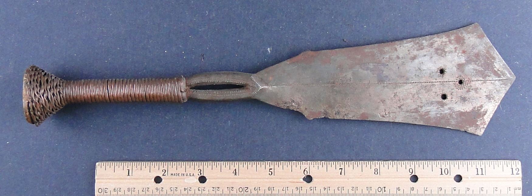 Description: Two African knives: (1) A decorated knife with broad, straight blade, handle wrapped with copper wire, made by the Yakoma Tribe; it is believed that they were used as currency. See Opitz, pp. 184-86 (illustrated, p. 186). (2) A ceremonial knife with a dull blade made by the Fon, a Ewe Tribe from Dahomey; the blade has the outline of a lion standing atop a supine man. See Opitz, pp. 181-83 (illustrated, p. 183).