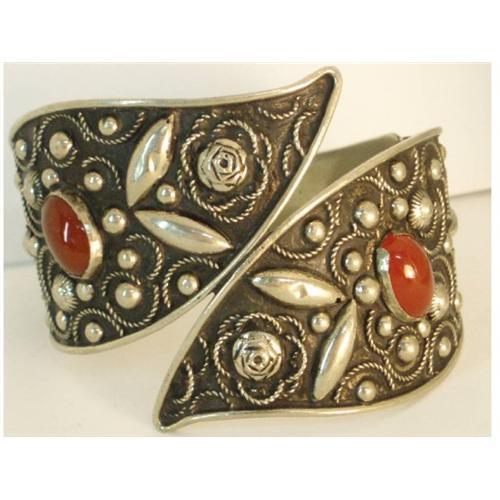 Medieval or Gothic or just gorgeous, describes this 2" wide wrap cuff enamel and silver bracelet. The hinges are on the sides so it fits comfortably. This is 8" long on the inside and has two large genuine carnelian cabachons set into the fancy metal work. Looks like a very expensive artisan bracelet and it is marked on the inside Made in Italy.