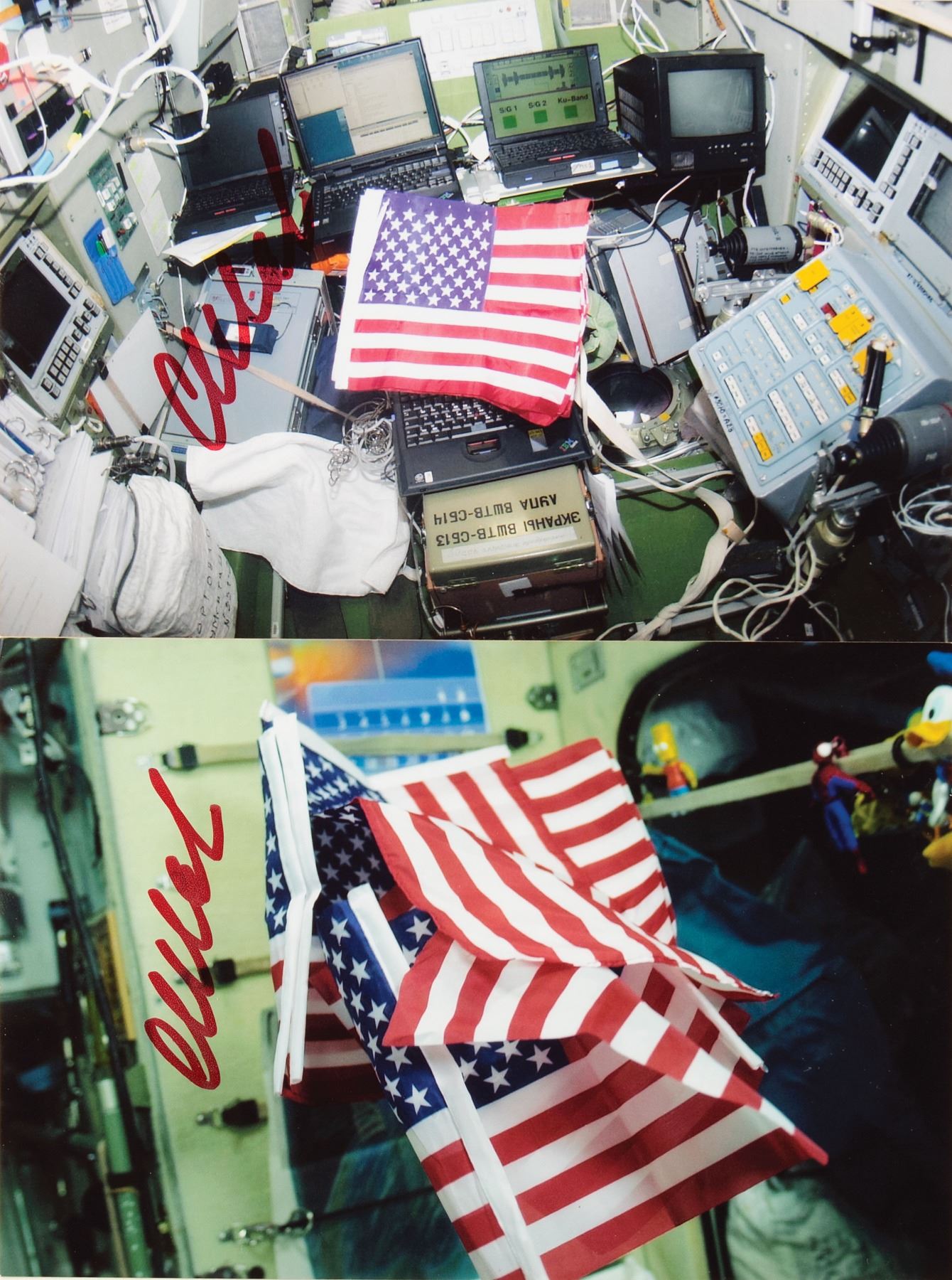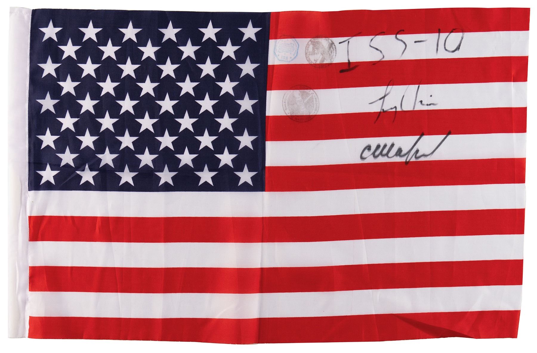Flown American flag carried on the International Space Station for 192 days during Expedition 10, 18.5 x 11.5, marked in black felt tip, "ISS-10," and signed by both members of the crew, Leroy Chiao and Salizhan Sharipov. The flag bears three ISS ink stamps, done in-flight onboard the station. In fine condition. Accompanied by two photos of the American flags carried on the ISS (both signed in felt tip by Sharipov), and a certificate of authenticity signed by Sharipov. Originally given as a gift to Alex Panchenko.