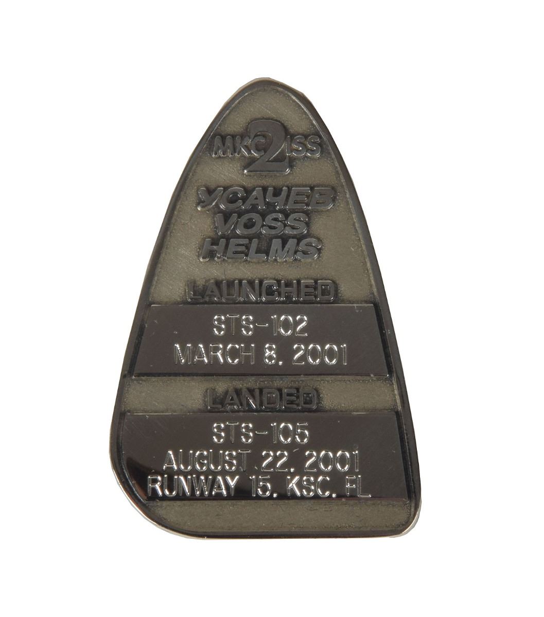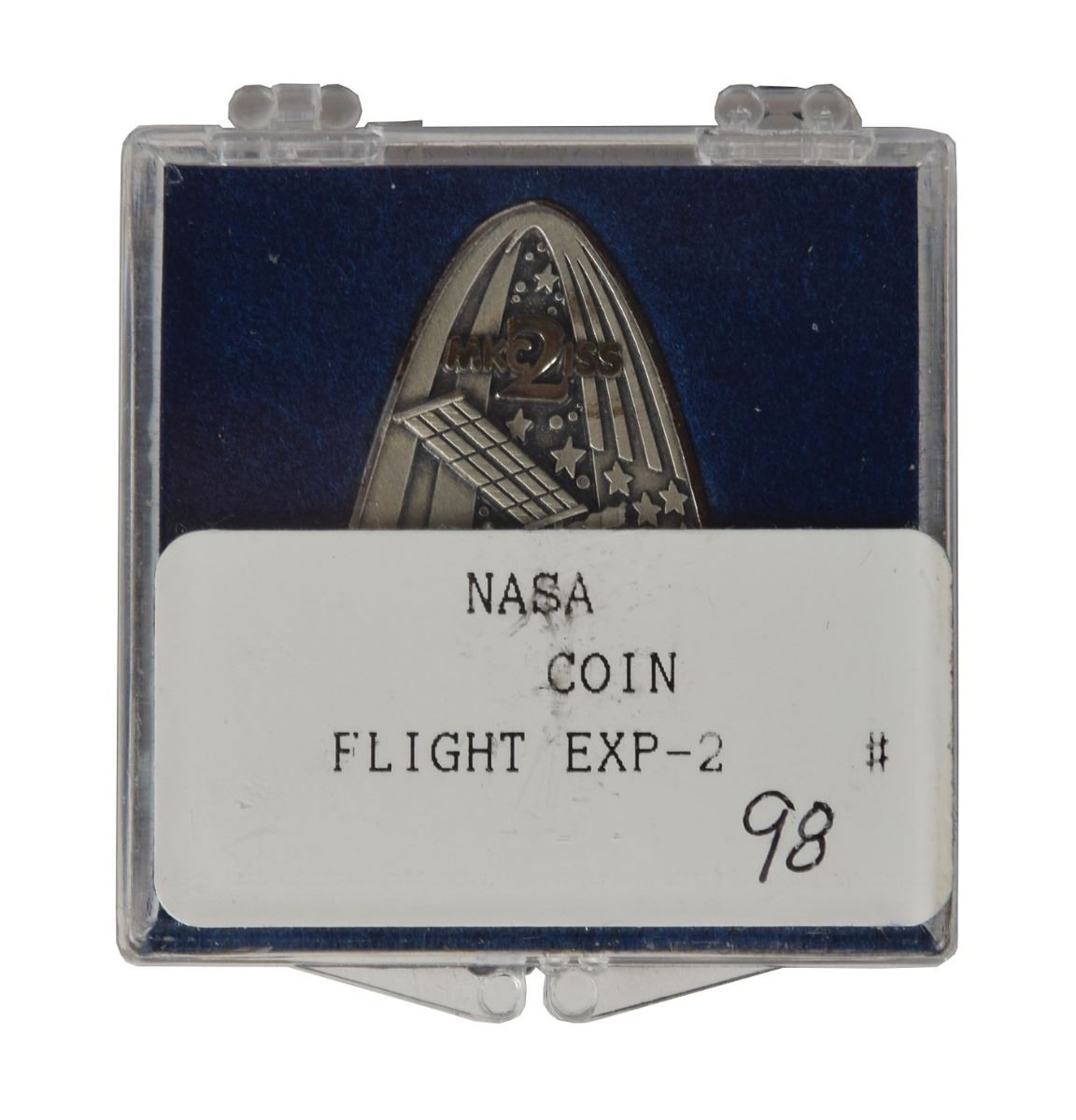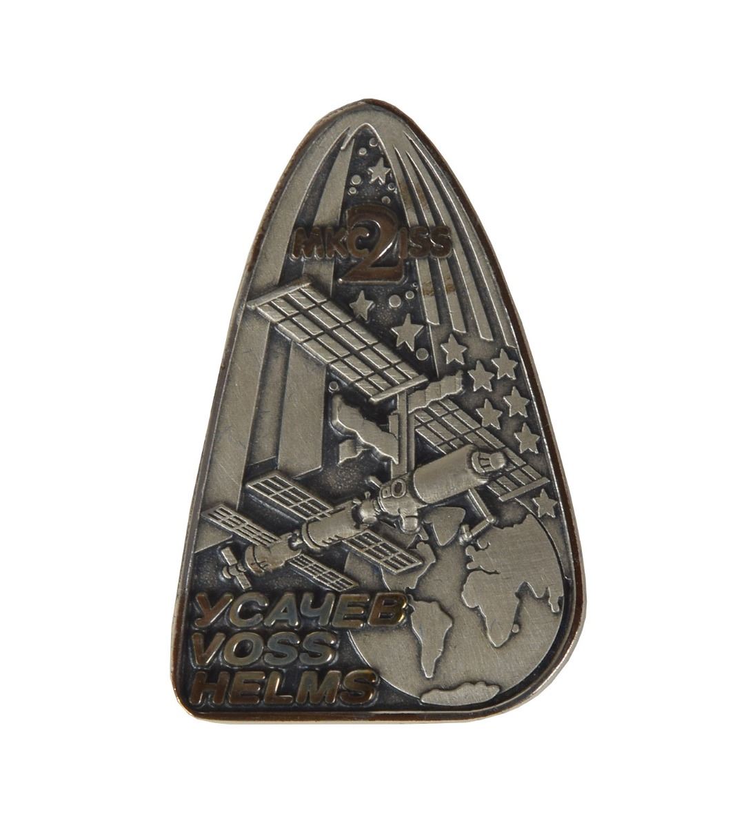 Unflown sterling silver Expedition 2 Robbins medal, 1 x 1.75, with a raised design of the mission insignia on the face and engraved on the reverse with the STS-102 launch date of March 8, 2001, and the STS-105 landing date of August 22, 2001, "Runway 15, KSC, FL." The medal is serial numbered “98” on an edge and includes its original matching case, also bearing a “98” serial number. In mint state condition. Originates from the personal collection of a Robbins Company executive.