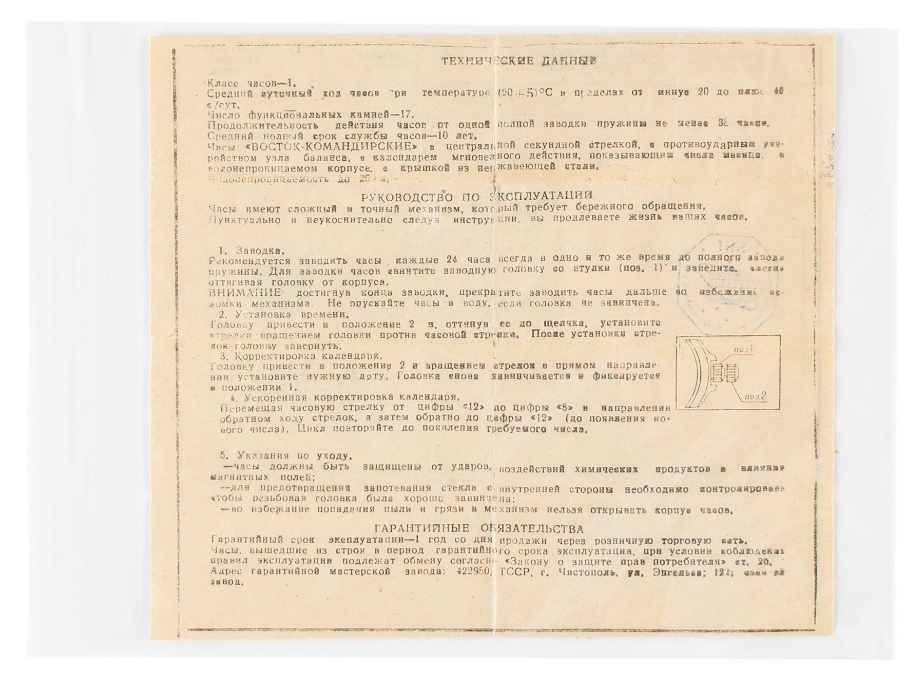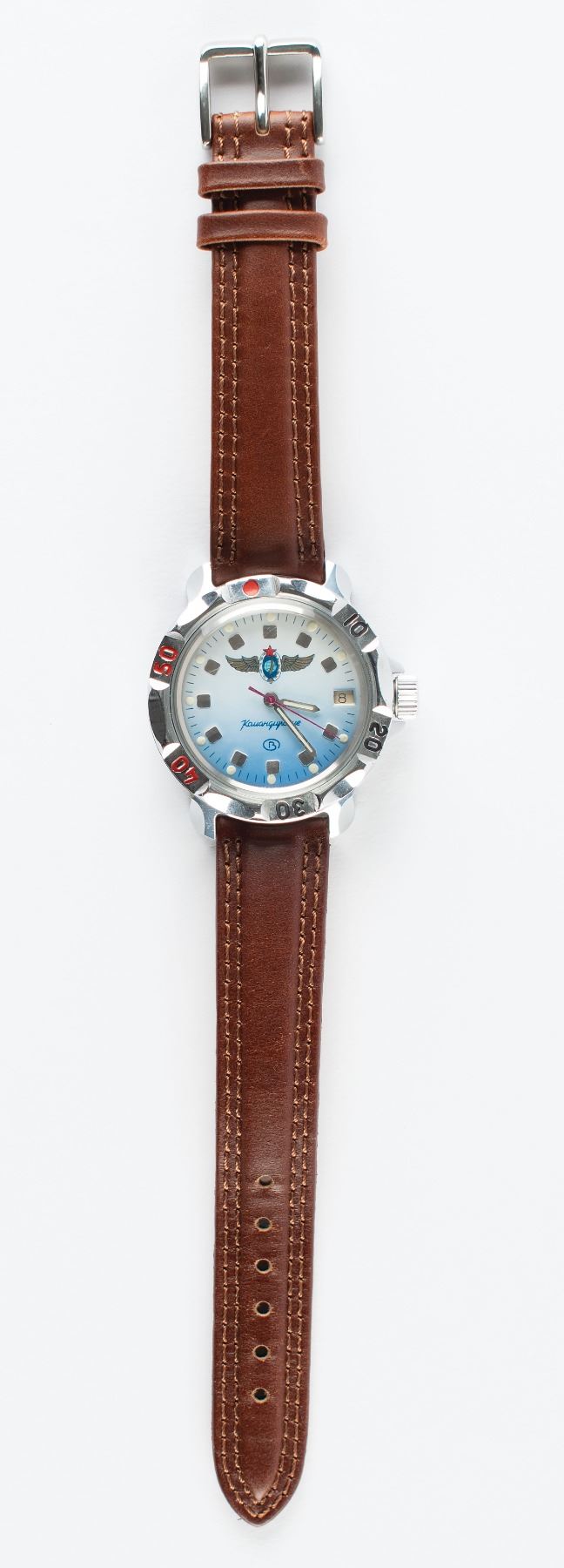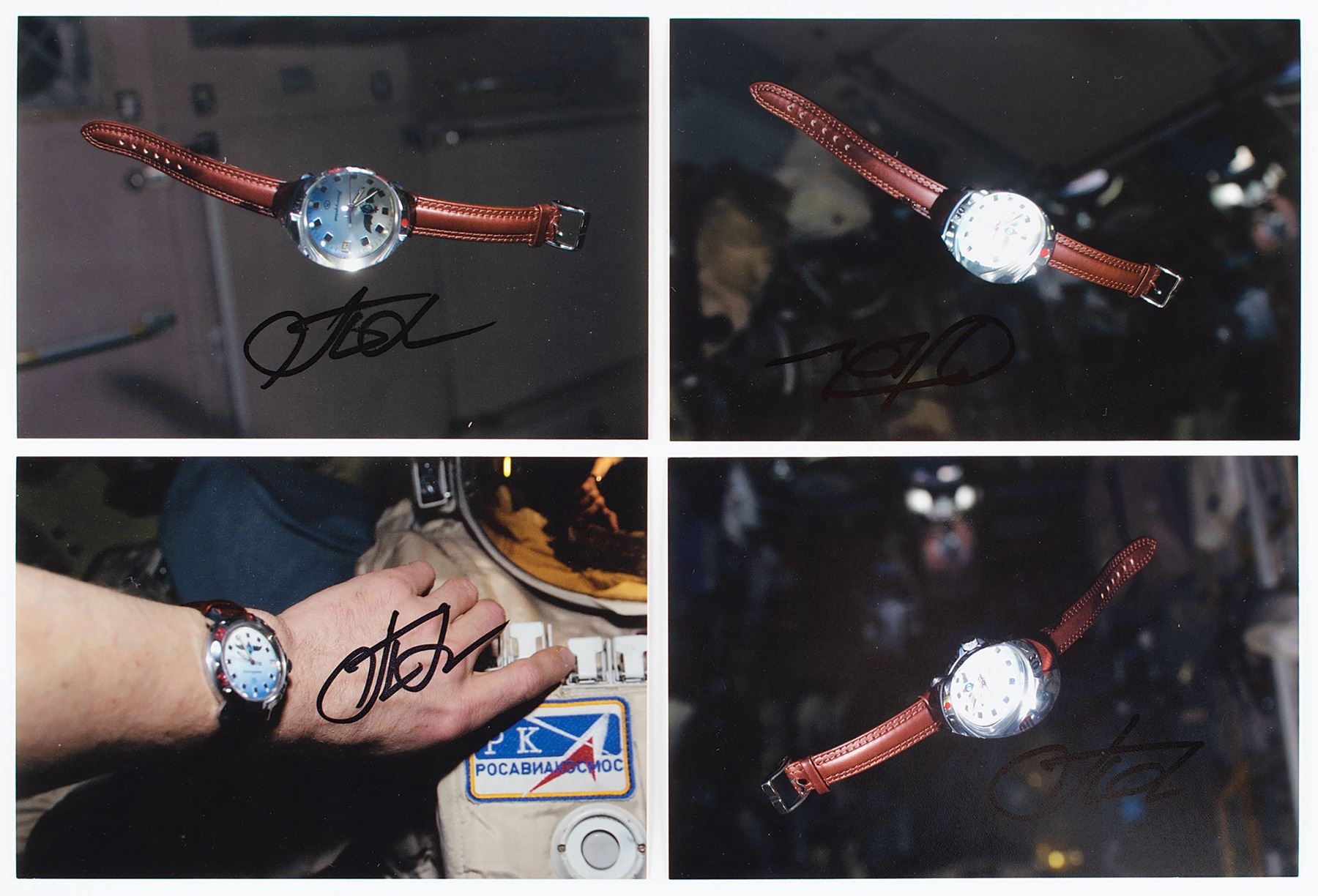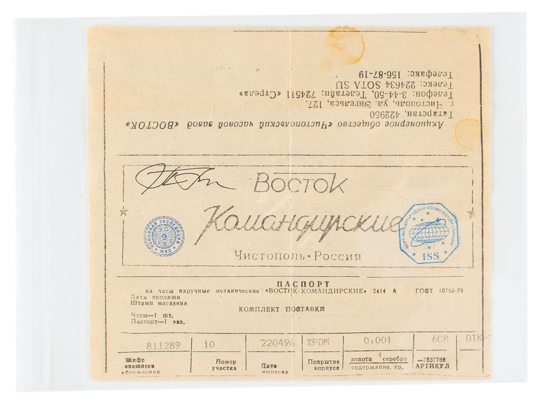 Flown Russian Vostok 'Komandirskie' men's mechanical watch carried to the International Space Station aboard Soyuz TMA-4 for Expedition 9. The watch was carried by Gennady Padalka to commemorate the Russian Space Forces and the upcoming first flight of Space Forces cosmonaut Yuri Shargin, who returned from the ISS together with Padalka aboard Soyuz TMA-4. Shargin arrived on the ISS via Soyuz TMA-5, and spent almost ten days in orbit before returning home. The face of the watch depicts the wings of Russian Military Space Forces. The caseback is engraved with an image and indicates that the watch is water-resistant. The timepiece remains on its original brown leather watchband, also flown on the ISS. Includes a flown piece of paper stamped in-flight onboard the ISS. In fine condition. Accompanied by four photos of the watch onboard the International Space Station, all signed in black felt tip by Gennady Padalka.