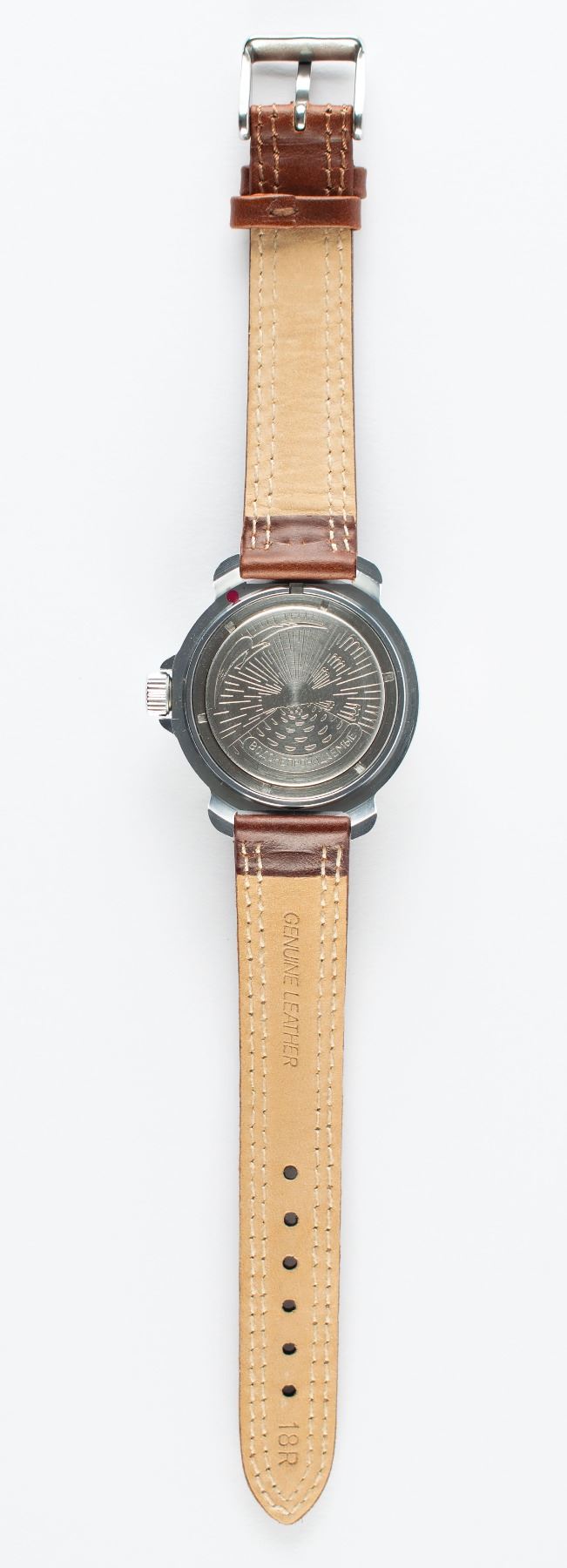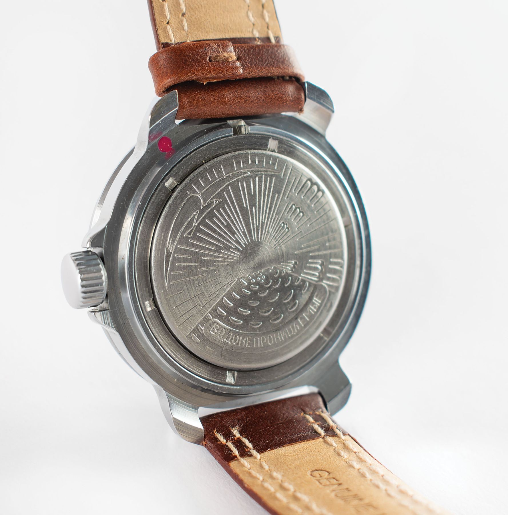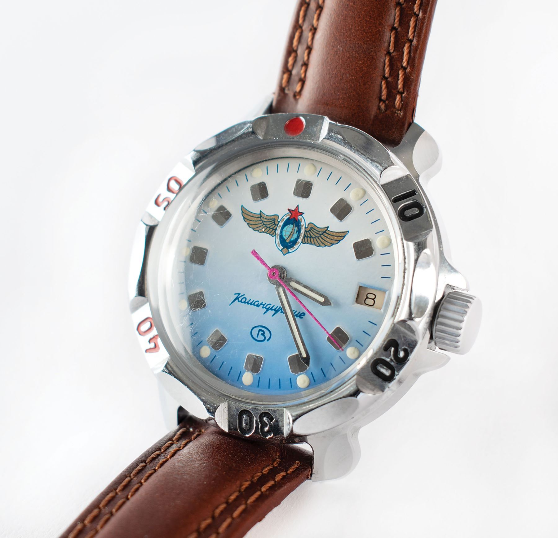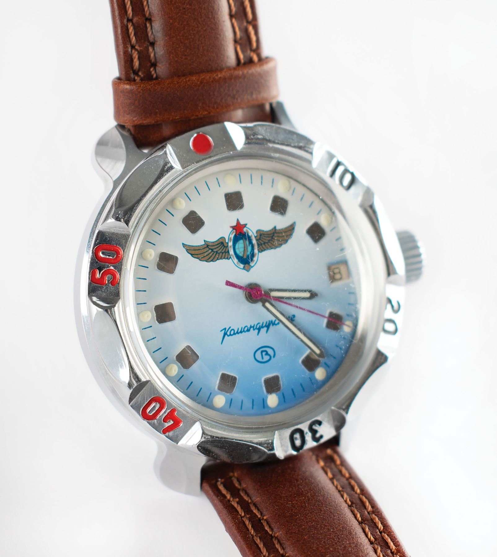 Flown Russian Vostok 'Komandirskie' men's mechanical watch carried to the International Space Station aboard Soyuz TMA-4 for Expedition 9. The watch was carried by Gennady Padalka to commemorate the Russian Space Forces and the upcoming first flight of Space Forces cosmonaut Yuri Shargin, who returned from the ISS together with Padalka aboard Soyuz TMA-4. Shargin arrived on the ISS via Soyuz TMA-5, and spent almost ten days in orbit before returning home. The face of the watch depicts the wings of Russian Military Space Forces. The caseback is engraved with an image and indicates that the watch is water-resistant. The timepiece remains on its original brown leather watchband, also flown on the ISS. Includes a flown piece of paper stamped in-flight onboard the ISS. In fine condition. Accompanied by four photos of the watch onboard the International Space Station, all signed in black felt tip by Gennady Padalka.