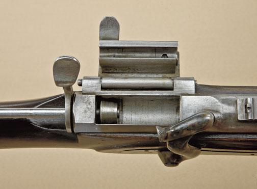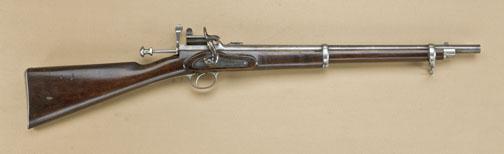Experimental Civil War era carbine, attributed to Terry. Carbine shows .58 caliber, 22” barrel, 38-1/2” overall in fine to excellent condition showing original bright and case hardened finishes. Nomarkings or serial numbers. This unusual prototype carbine was originally in the Bob Jeska collection, who specialized in rare military arms and particularly rare Civil War Carbines. The action is exposed by a boltmounted on the right side at rear of frame and a trapdoor type hinge which flips up, similar to Snyder. A plunger type bolt pulls to the reverse to expose the breech. The bolt is pushed forward to close the breech, thetrapdoor closes to lock, the bolt handle closes to lock, which secures the breech. The hammer is manually cocked and the nipple primed. A solid and good design. The carbine is in near fine condition showing just slight staining to the bright finishes and beginning normal aging. The lock and hammer show 95% bright original case hardening that is still firing. The stocks are very good plus to near fine with some storage type