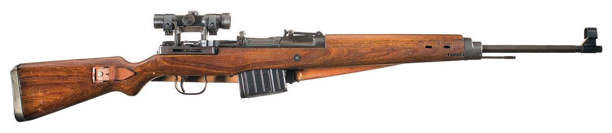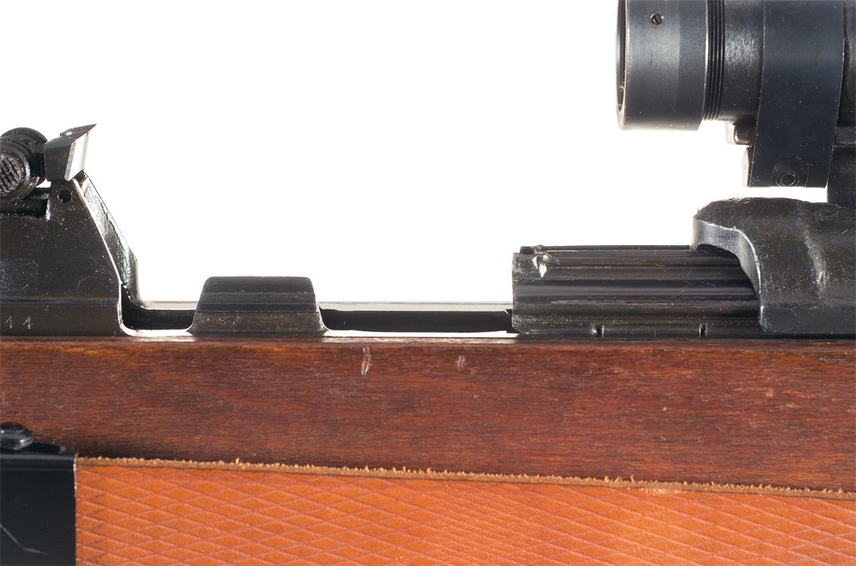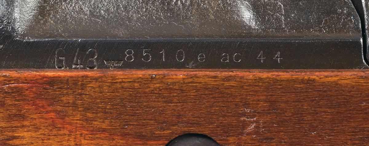 This is an excellent example of a Walther produced G43 semi-automatic sniper rifle with an extra length barrel. The barrel measures 25 inches in length, which is three inches longer than the standard 22 inch length. (Refer to page 105 of "The German Sniper 1914-1945" by Senich, in which he states that this was done to improve accuracy.) Additionally, the rifle was fitted with a dual bolt guide rib for increased stability and accuracy. The left side of the receiver is marked with the Nazi Eagle proof ahead of "G43" followed by the serial number and a stamped "ac / 44" code indicating manufacture at the Walther plant. The serial number is also present on the left side of the bolt carrier under the cocking lever and an "eagle / 359" proof above the serial number. The hollow cocking knob is on the left side and the safety lever is on the rear of the receiver. The action cover is the stamped version with the automatic sliding dust cover. This rifle has the side mounted quick release scope mount and unmarked ZF style scope. The rifle has the standard hooded blade front sight with the standard military rear tangent sight graduated to 1,200 meters. The stock and matching handguard are the correct WWII pistol grip laminated version with a cupped steel buttplate with the buttstock compartment. The left side of the stock has two crisp "eagle swastika / 359" proofs and the pistol grip area has an Eagle Waffenamt proof with the matching serial number and "eagle / 359" proof on the underside. One of the inspector proofs was added next to a small stock blemish, indicating the blemish was noted at the factory and did not occur later. Complete with a cleaning rod with slotted head, brown leather sling with diamond pattern and "avx" marked K43 magazine.