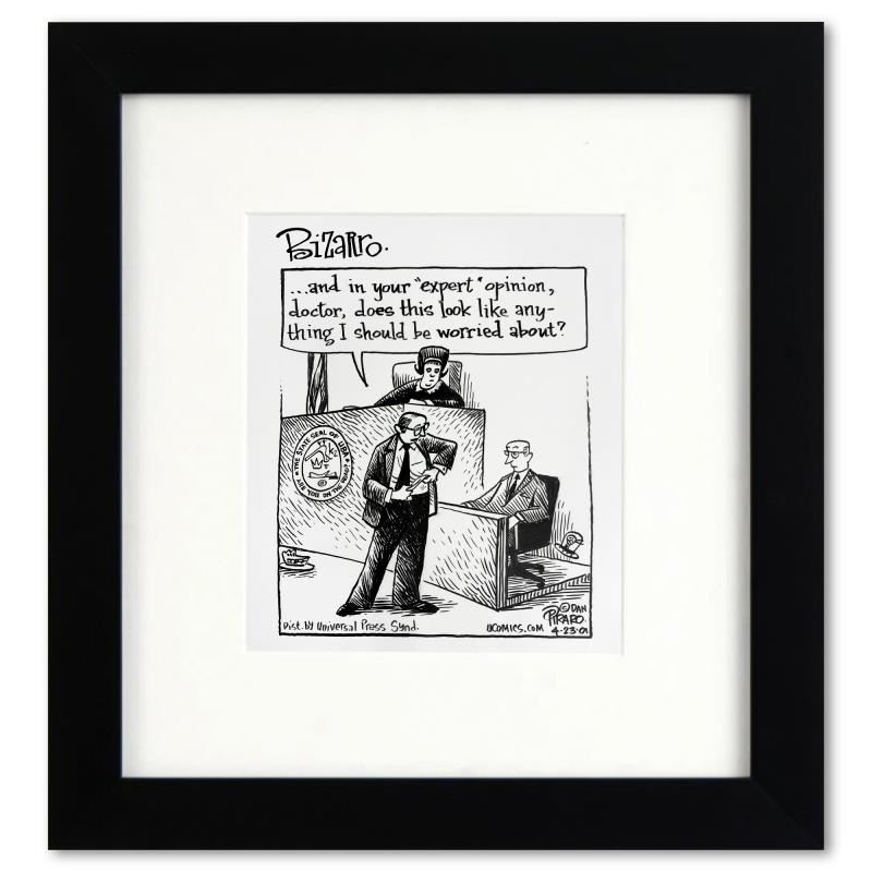 Enter a surreal and satirical world of twisted imagination and award winning creativity. "Expert Opinion" is an original pen & ink drawing on paper by Dan Piraro, creator of the critically acclaimed and award winning comic strip, Bizarro. This piece is hand signed, comes custom framed and includes a letter of authenticity. Measures approximately 12" x 11" (frame), 7" x 6" (image).This item requires special handling and may have a longer than usual turnaround.