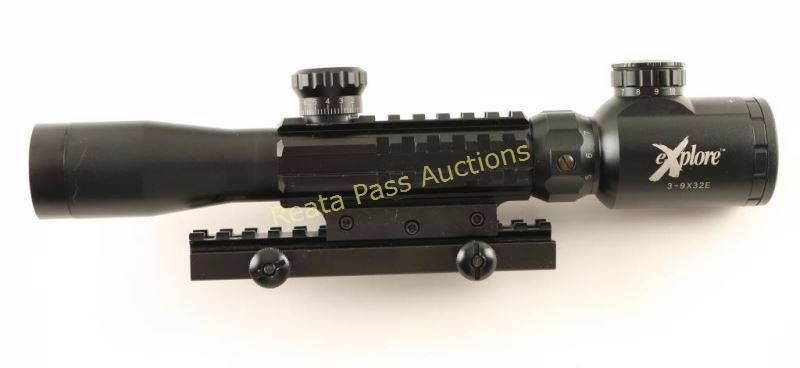 'Big Bore' Tactical sporting scope with matte black finish, tri-rail body, Mil-Dot reticle with variable power illumination, target turrets, adjustable eye-piece, variable 3-9 power and 32mm objective lens. Includes factory box and a quick detach base that's ready to mount to your flat-top AR rifle. In overall excellent condition.