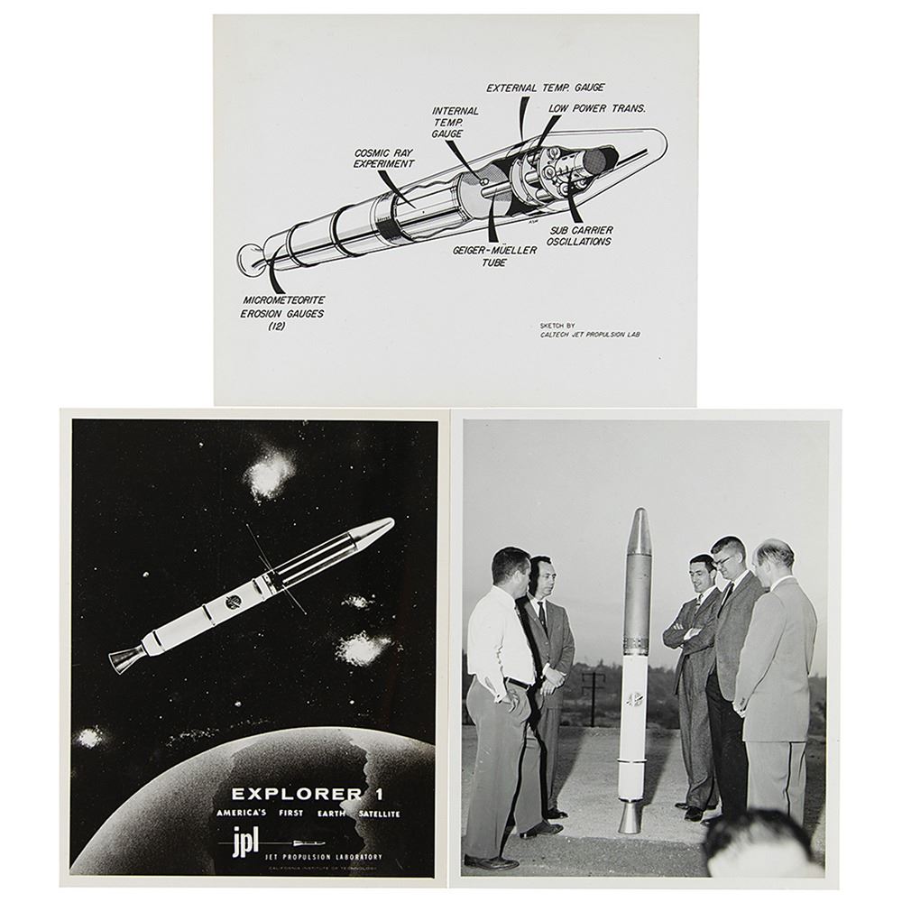 Three original vintage glossy 8 x 10 silver gelatin photos related to Explorer 1, America's first satellite. Includes a JPL image of the Explorer in orbit, a schematic diagram by the Caltech Jet Propulsion Lab, and a photo of several scientists standing around the 80-inch tall satellite. In overall fine condition.