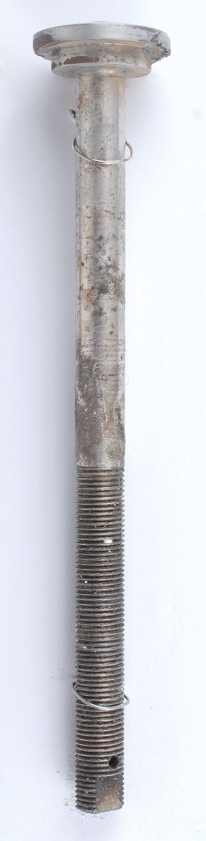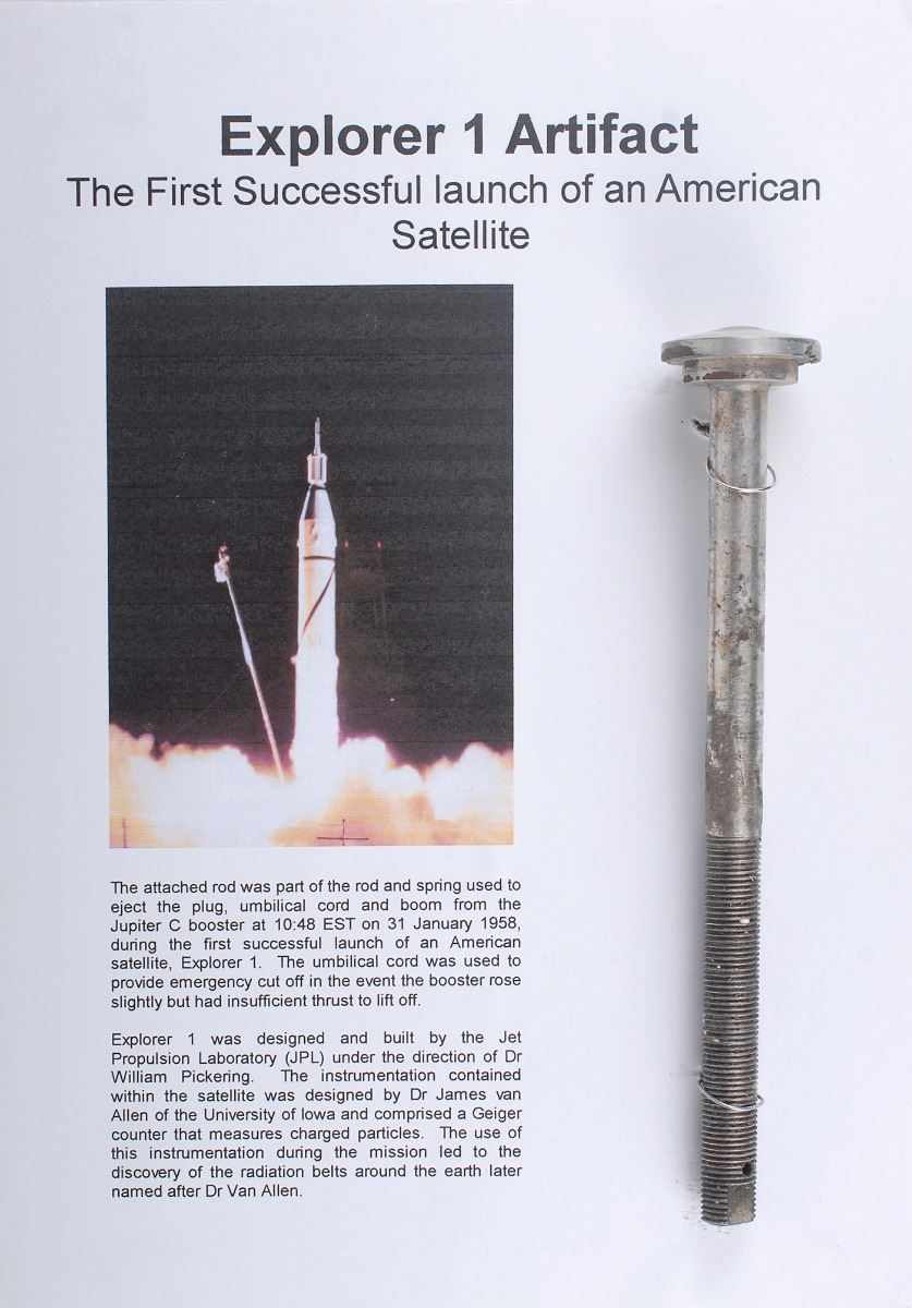 Valve-shaped 7.75? metal rod used in the successful launch of the Explorer 1 satellite on January 31, 1958. An integral part of the rod-spring combo designed to eject the plug, umbilical cord, and boom from the Jupiter C booster. The rod is suspended by wire to an 8.25 x 11.75 presentation sheet affixed to a same-size mat. In fine condition, with expected wear and grease to exterior. Accompanied by a copy of a handwritten letter of provenance from former NASA employee Russell Clay, in part: “I am sending you some souvenirs of our last satellite firing in a package which you should get in a day or two…I will tell you what they are, you can tell your dad and he can explain what they do. The valve shaped rod with a spring around it is used to eject the boom.”