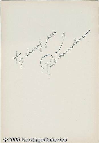 <B>Explorer Roald Amundsen Autograph Sentiment Signed</B></I> Signed, "Very sincerely yours Roald Amundsen," 6.25" x 9". From 1903-1906, Norwegian explorer Amundsen was the first to navigate the Northwest Passage aboard his ship <I>Gjoa.</B></I> After his hopes to become the first to reach the North Pole were dashed by news of Peary's successful assault, he turned his ship Fram south. On December 14, 1911, he and four members of his party became the first humans to stand on the South Pole. Fine condition. <I>Accompanied by COA from PSA/DNA.</B></I>