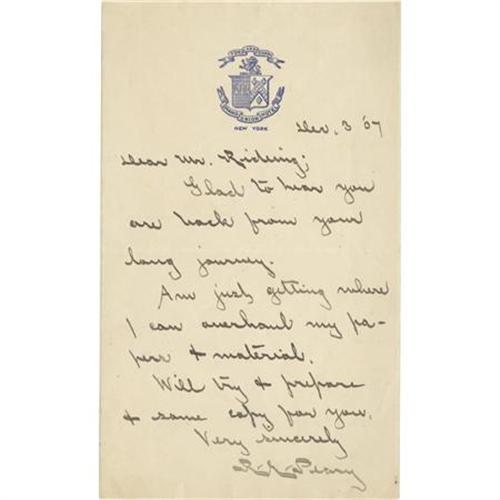 <B>Explorer Robert E. Peary Autograph Letter Signed</B></I> on Grand Union Hotel letterhead, 1 page, 4.75" x 8", New York , Dec. 3, 1907, to a Mr. Rideing. In full: "<I>Glad to hear you are back from your long journey. Am just getting where I can overhaul my papers & material. Will try to prepare & save copy for you.</B></I>" The recipient is likely writer William H. Rideing. The date suggests that Peary is organizing his journals and notes made during a recent attempt to reach the North Pole. Peary made several such attempts between 1898 and 1905. Peary's final, and successful, attempt would begin the following year in 1908. <I>From the collection of Henry E. Luhrs</B></I> <BR><BR><b>Shipping:</b> Flat Material, Small (<a target="_blank" href="http://www.heritageauctions.com/common/shipping.php">view shipping information</a>)