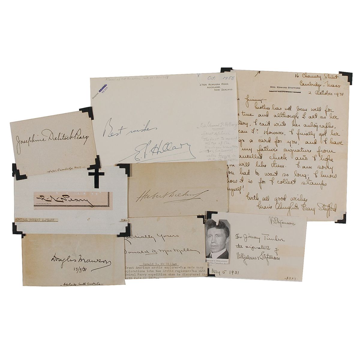 Six vintage ink signatures on various size cards and clipped slips, each signed by a different explorer. Signers are: Ed Hillary, Richard Peary, Vilhjalmur Stefansson, Donald B. McMillan, Douglas Mawson, and Hubert Wilkins. Also incuded is a signature from Peary’s wife Josephine and an ALS from his daughter Marie. In very good condition, with various scattered toning, trimmed edges, folds, and mounting remnants to some of the corners.