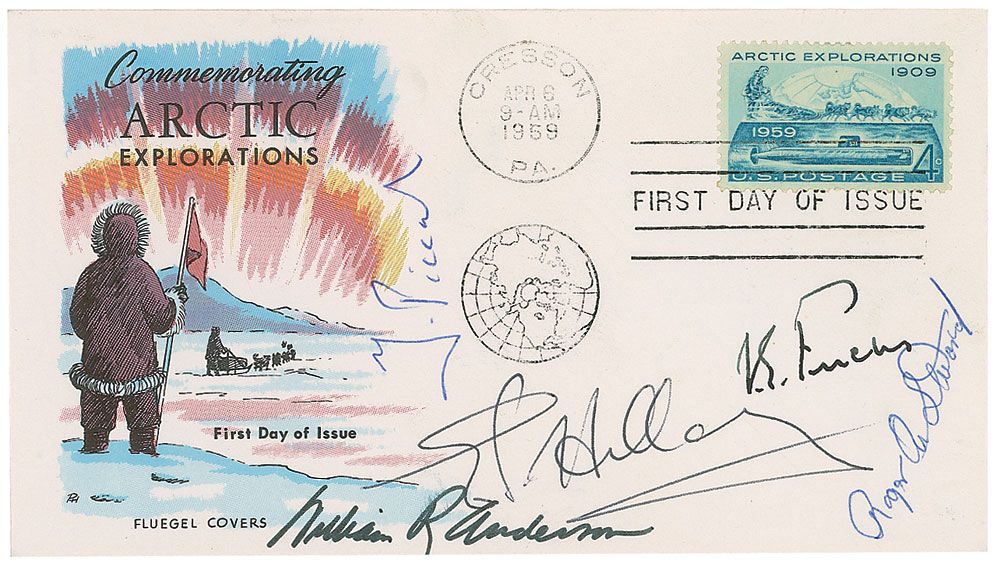FDC, 6.5 x 3.75, with a cachet honoring Arctic exploration, signed on the front in ink and ballpoint by five Arctic explorers: William Anderson, captain of the first submarine to travel under the polar ice cap; Vivian Fuchs; underwater explorer Jacques Piccard; Sir Edmund Hillary, the first to reach to summit of Mt. Everest; and Roger Stewart, Captain of the icebreaker Manhattan on the Arctic Exploration. In fine condition.