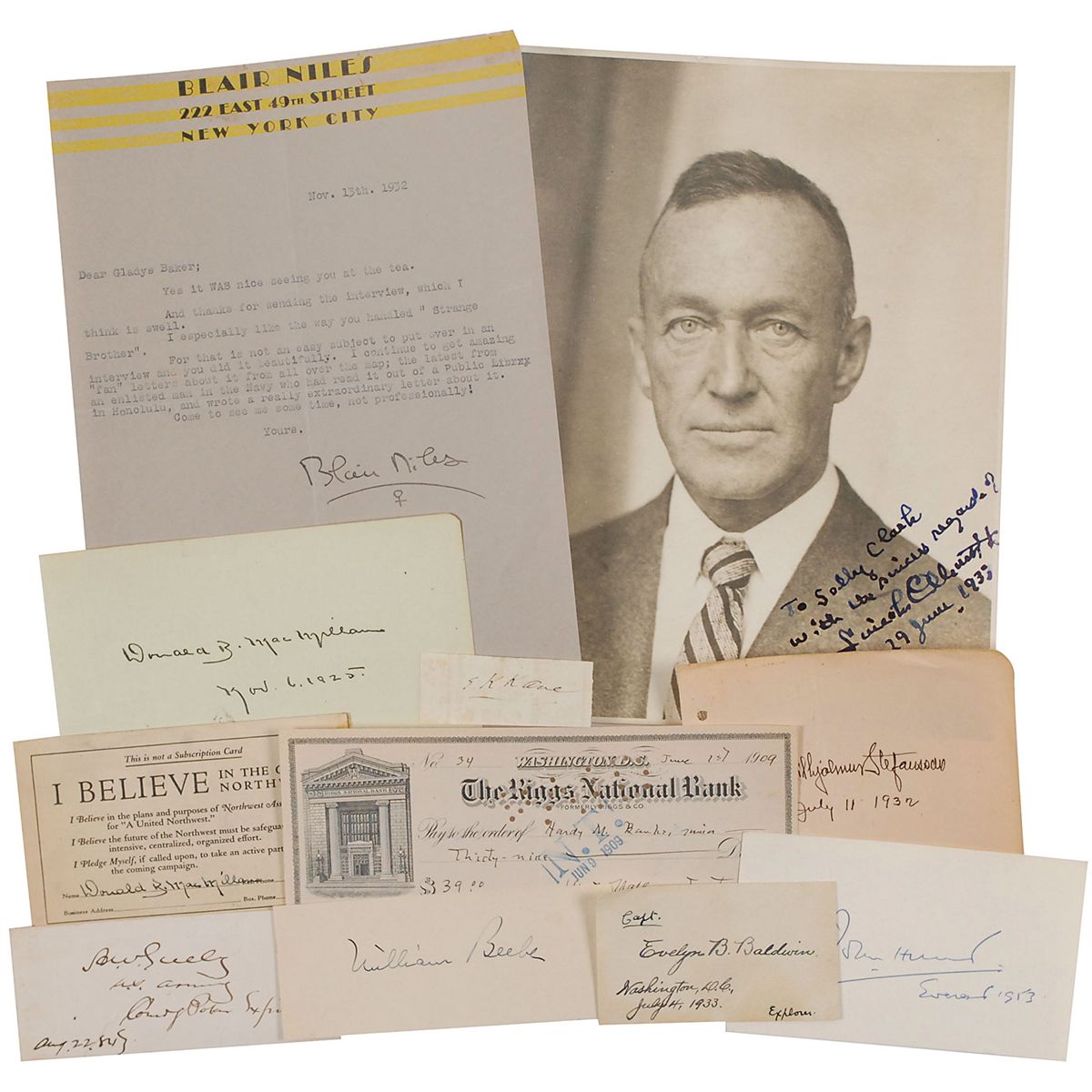 Collection of 11 items, primarily consisting of signatures as well as a few letters, a check, and a photo, each signed by an explorer. Signers are: Evelyn Baldwin, William Beebe, Lincoln Ellsworth, Adolphus W. Greely, John Hunt, Elisha Kane, Donald MacMillan (2), Blair Niles, Vilhjalmur Stefansson, and Walter Wellman. In overall fine condition.