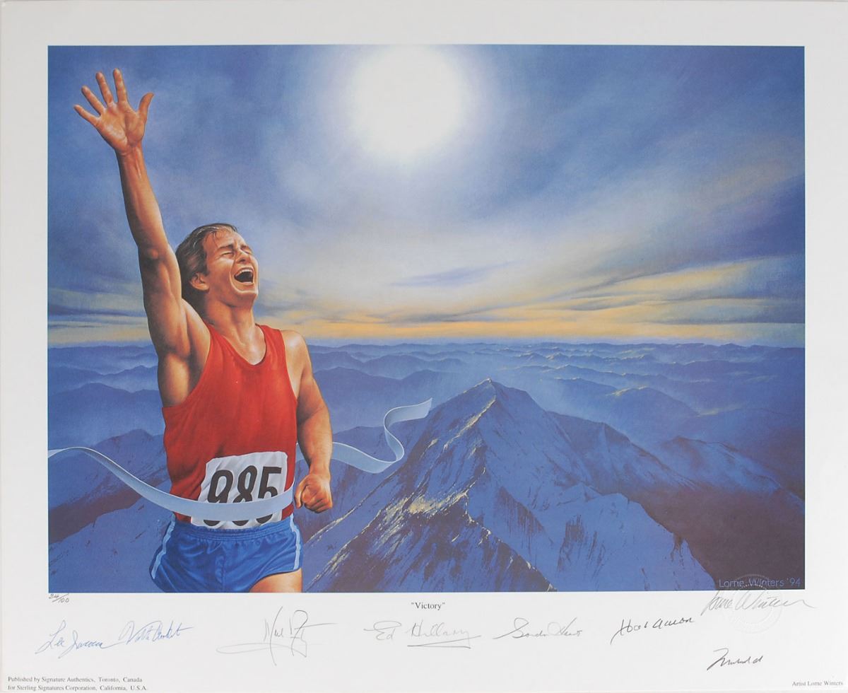 Uncommon color limited edition 22.5 x 18.75 lithograph of a 1994 Lorne Winters painting entitled ‘Victory,’ depicting a triumphant runner against a mountainous backdrop, numbered 34/100, signed in the lower border in pencil by Neil Armstrong, Muhammad Ali, Edmund Hillary, Hank Aaron, and Gordie Howe, and in blue ballpoint by Walter Cronkite and Lee Iacocca. Also blindstamped and signed in pencil by the artist. In fine condition. The Armstrong signature has been pre-certified by Zarelli Space Authentication.