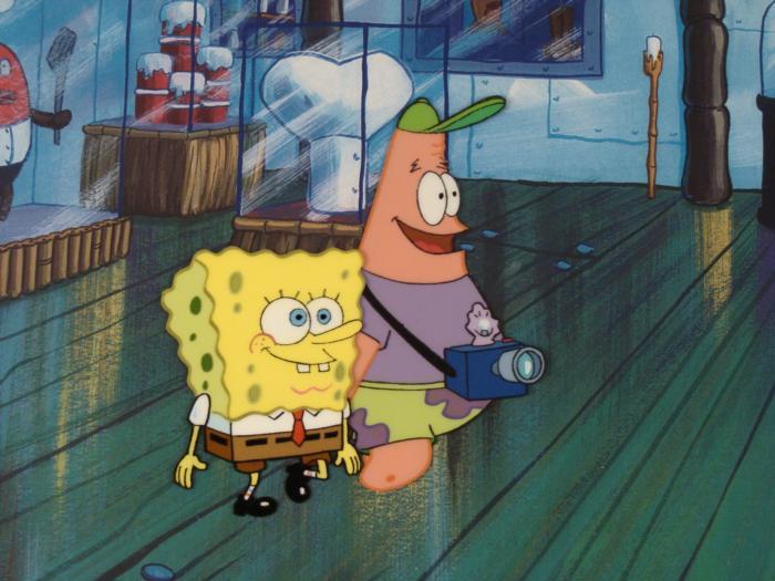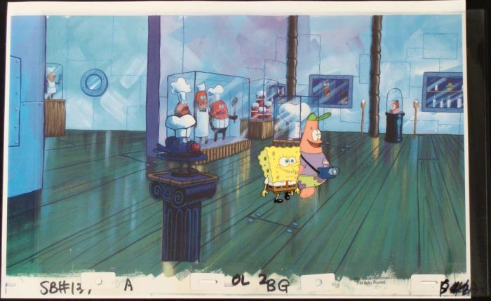 This animation cel and reproduction background are from the Nickelodeon TV show SpongeBob Squarepants. The story takes place under the deep blue sea in Bikini Bottom, where SpongeBob resides. SpongeBob, who is a yellow, porous sponge, is your typical happy-go-lucky character, as he is always cheerful and enjoys making people laugh. Patrick Star is SpongeBob's neighbor who boasts knowing nothing, and is often getting himself into ridiculous situations. Between the homes of these two lies the home of the miserable Squidward, a squid, who is known for being grouchy and playing tricks on SpongeBob and Patrick. Both SpongeBob and Squidward work at the Krusty Krab, a fast food business run by the greedy money-loving Mr. Krabs, a crab, the arch rival of the evil, possibly misunderstood, Plankton. Another neighbor, Sandy Cheeks, an athletic squirrel who normally wears an astronaut's space suit, was introduced in "Tea at the Treedome." She spends most of her time inventing and experimenting. SpongeBob and Patrick are exploring the museum.Original Printed Background and Animated Cel Overall Size of Background: 11" x 17" Overall Size of the Cel: 10 1/2" x 16 1/2" Very good condition This is an original hand-painted cel set-up used in the production of an episode of "SpongeBob SquarePants." Each one-of-a-kind set-up represents a slight change in position of the characters. When individually photographed and projected in rapid succession, the images appear to move.