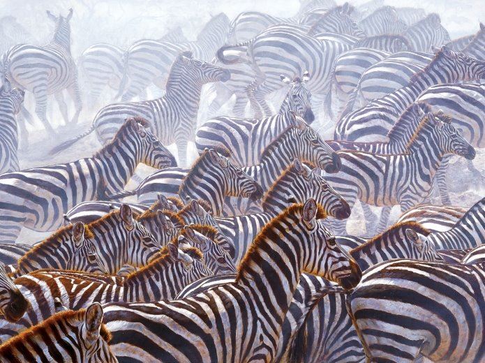 Canvas: 44" x 62" “Zebra seem to be quite skittish when approaching a waterhole and the slightest movement will set them off. When there are hundreds, their action creates total chaos. Running to and from the waters edge, the dust kicked up can be seen for miles and from a distance it looks like the after-haze of a distant explosion” - John Banovich