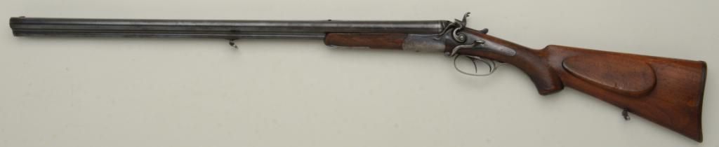 Exposed hammer German Drilling, no makers marks or agents name, German proofs on bottom of barrel, which measure 27-1/4", 16 gauge over 9.5mm, shows a straight case. The gun shows a side release lever, top lever foractivating rifle barrel, set trigger, flip up rear sight, horn butt plate and forend cap, lightly engraved mounts. The condition is good to very good, with good barrels that may clean to excellent; the gun locks tight with good sound stocks. Est.: $600-$1,200