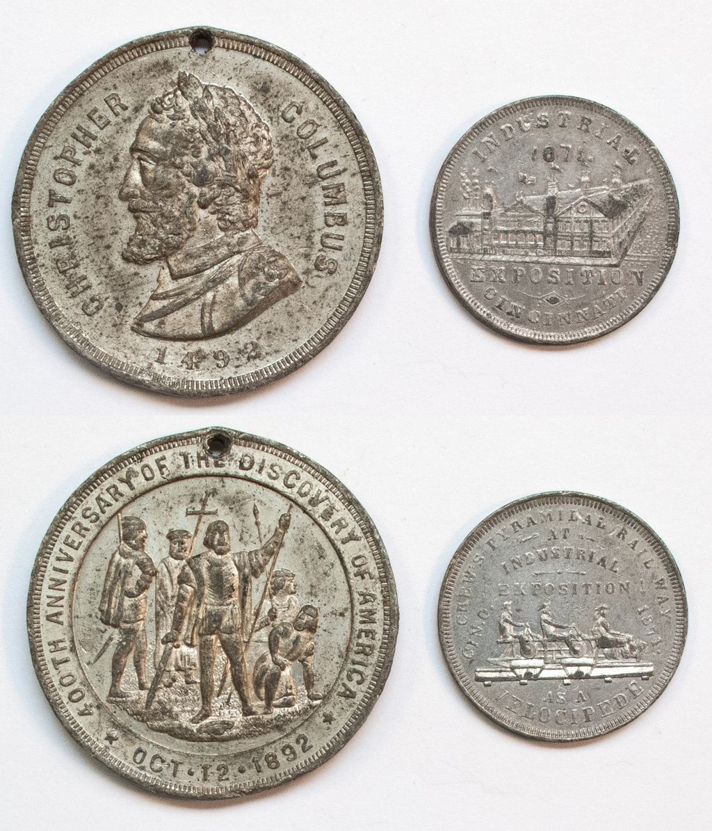 Lot of 2. 1) Christopher Columbus Commemorative, 1892, on the 400th anniversary of the Discovery of America, from the 1893 Columbian Exposition in Chicago. 2) Industrial Exposition in Cincinnati, Ohio, 1871, showing a velocipede.