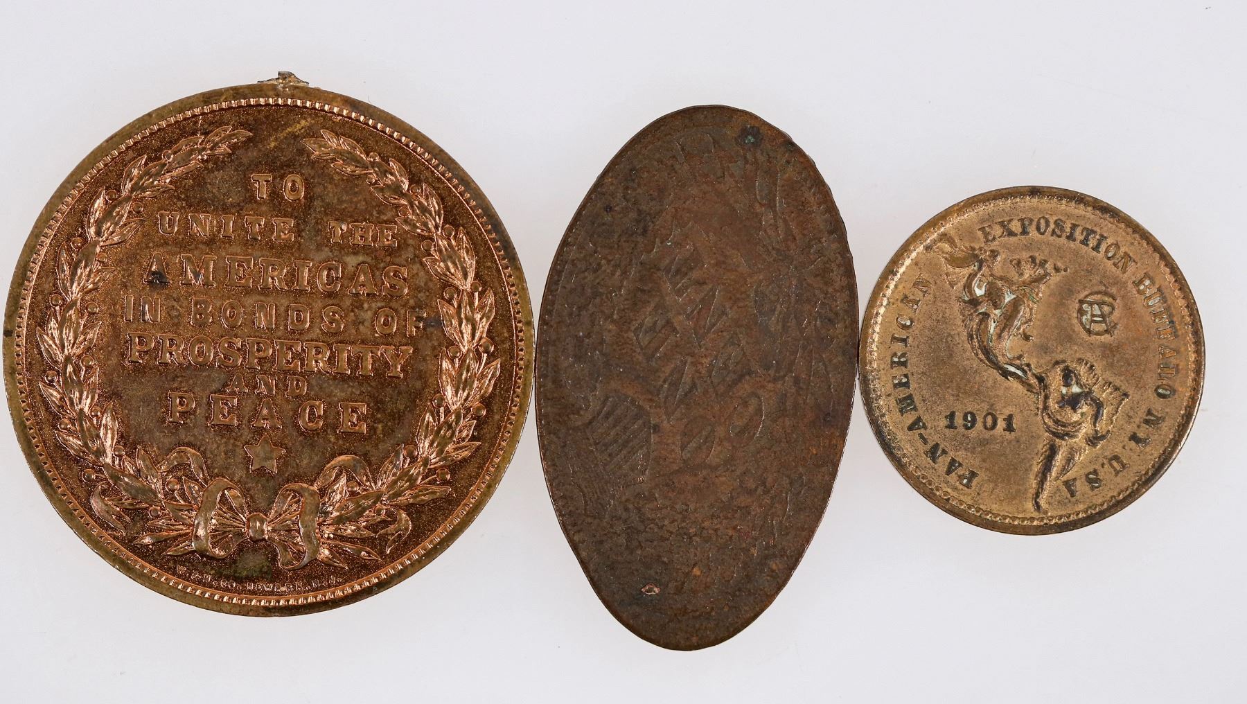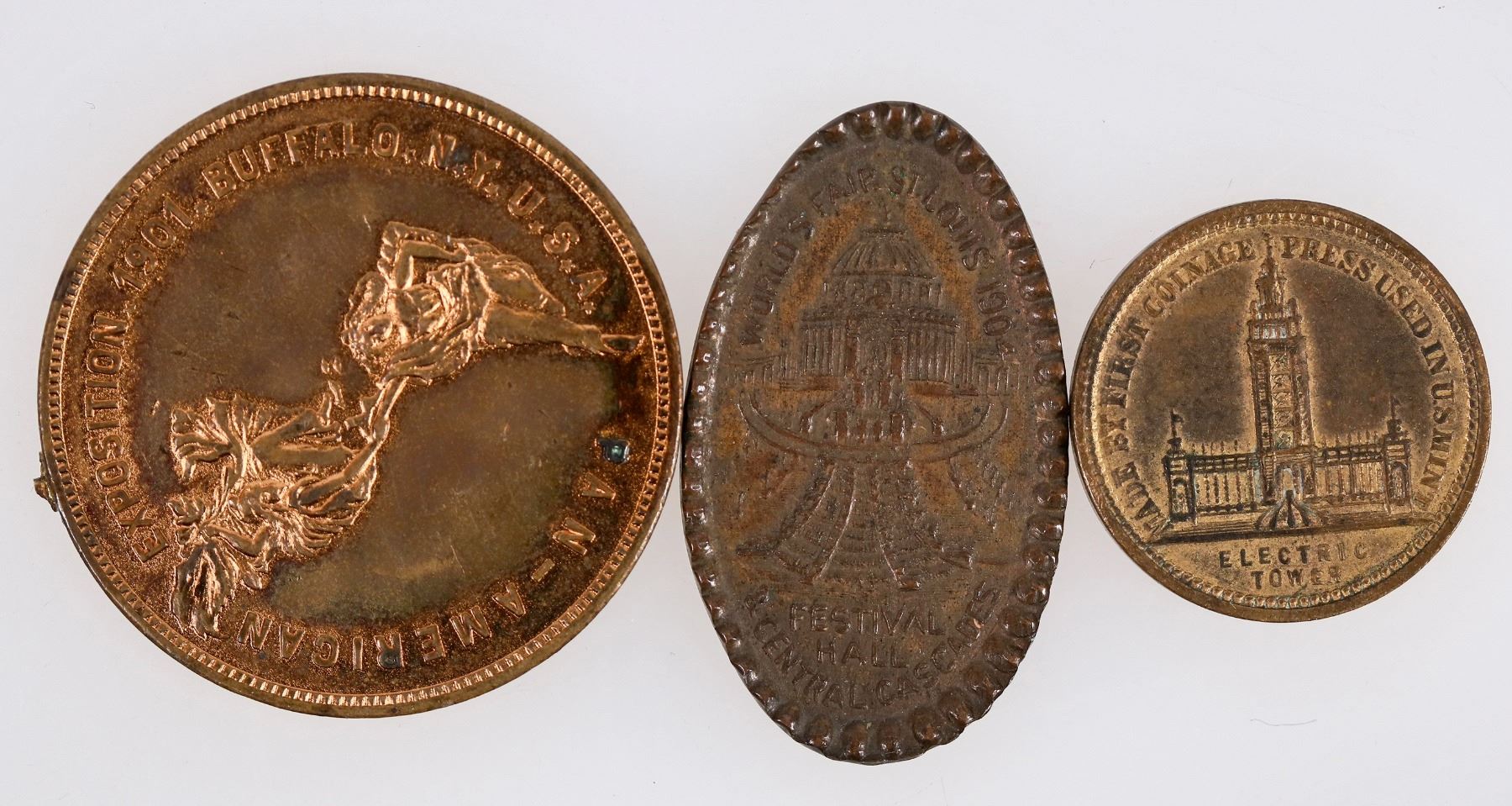 Three medals from U. S. Expositions: 1) 1901 Buffalo Pan American Exposition; Br., rd., 32 mm. 2) 1904 World's Fair St. Louis elongated Indian head cent. 3) 1901 Buffalo Pan American Exposition; Br., rd., 20 mm.