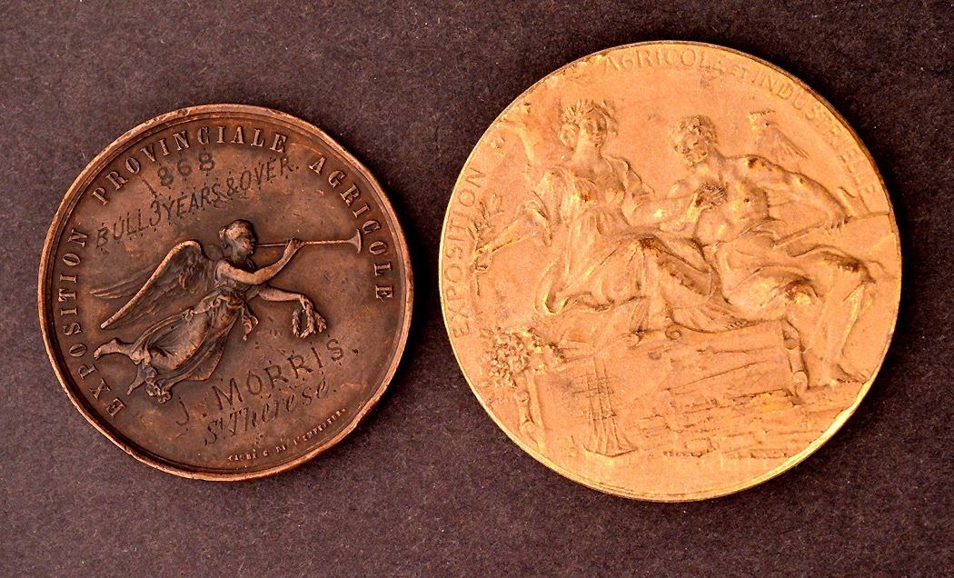 Chambre D'Agriculture du Bas Canada, Exposition Provinciale Agricole, Ae, 41.5mm, Lr.610, CH#EQCA-6, presented to J. Morris, St. Therese, for "Bull, 3Years & Older, 1868", Fine, edge bumps; Exposition Agricole Et Industrielle, Quebec, Ae, 50mm, Lr.1477, CH#EQCA-36, presented to P.E. Poulin, 1894, VF; total 2 medals