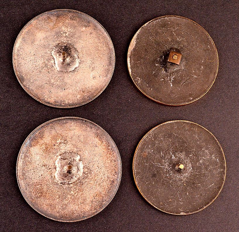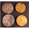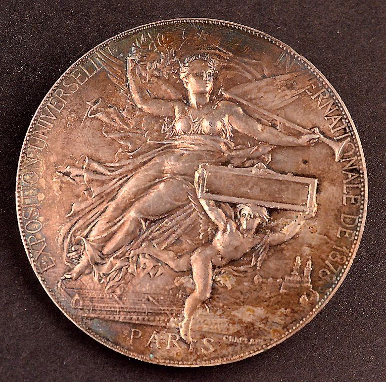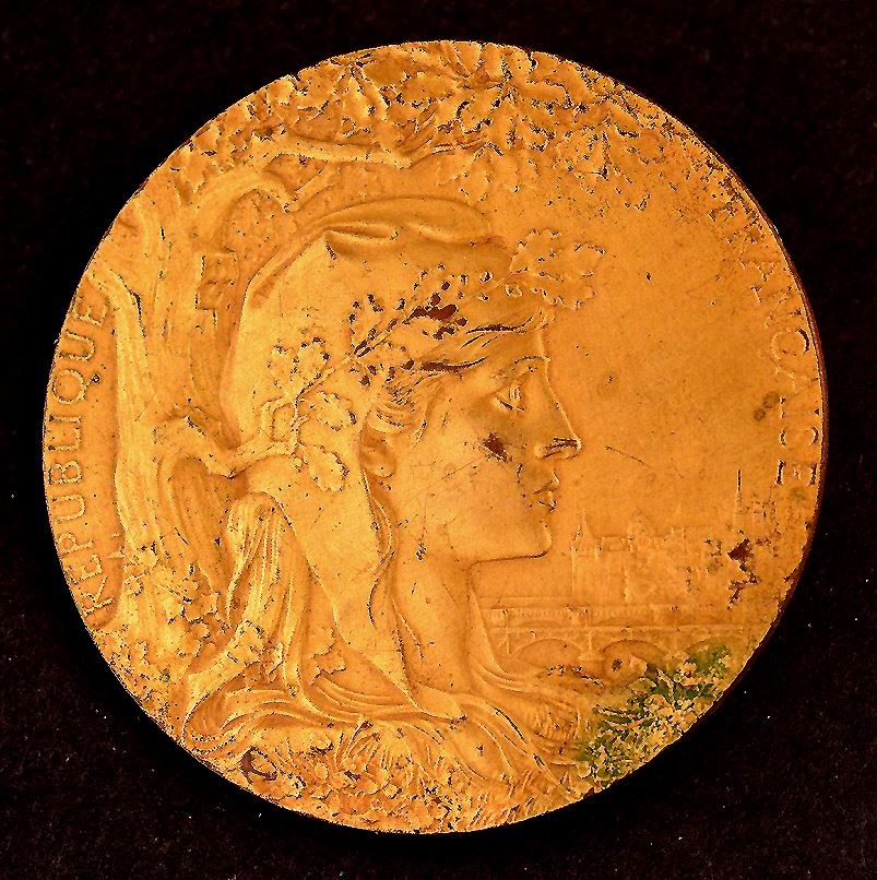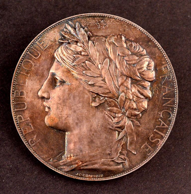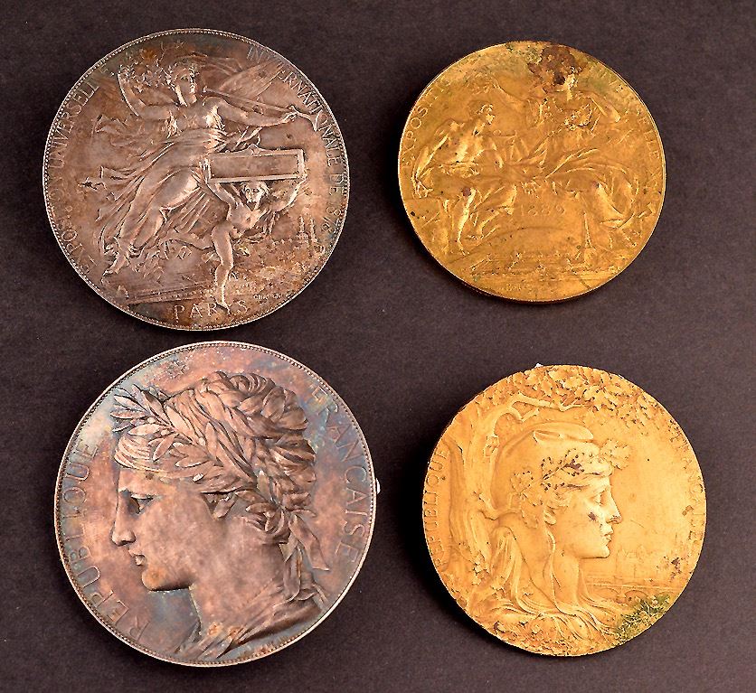 France, metal disks, with screw mounts on back, uniface, (1)- symbolic bust of the Republic, represented by a woman, with a laureate wreath tied to her head, facing left, "Republique Francaise", star above head, "J.C. Chaplain" in exergue; Ar, 67mm, 92.5gms, marked Argent on edge; (2)- Allegorical woman reclining, at centre, boy to her right, hlding a plaque, view of exposition grounds below, "Exposition Universelle International de 1878", "Paris" at bottom, signed by Champlain; Ar, 67mm, 93gms, marked Argent on edge; (3)- symbolic bust of the Republic, represented by a woman, with a cap and laureate wreath, facing right, "Republique Francaise", Oak tree to her left, view of city to her right, Ae, 63mm, corrosion; (4)- Allegorical man and woman, centre, "Exposition Universelle", "1889" at centre; by Travis Bottee, ae, 63mm, corrosion; Silver VF; bronze Fine, with issues; total 4 medals