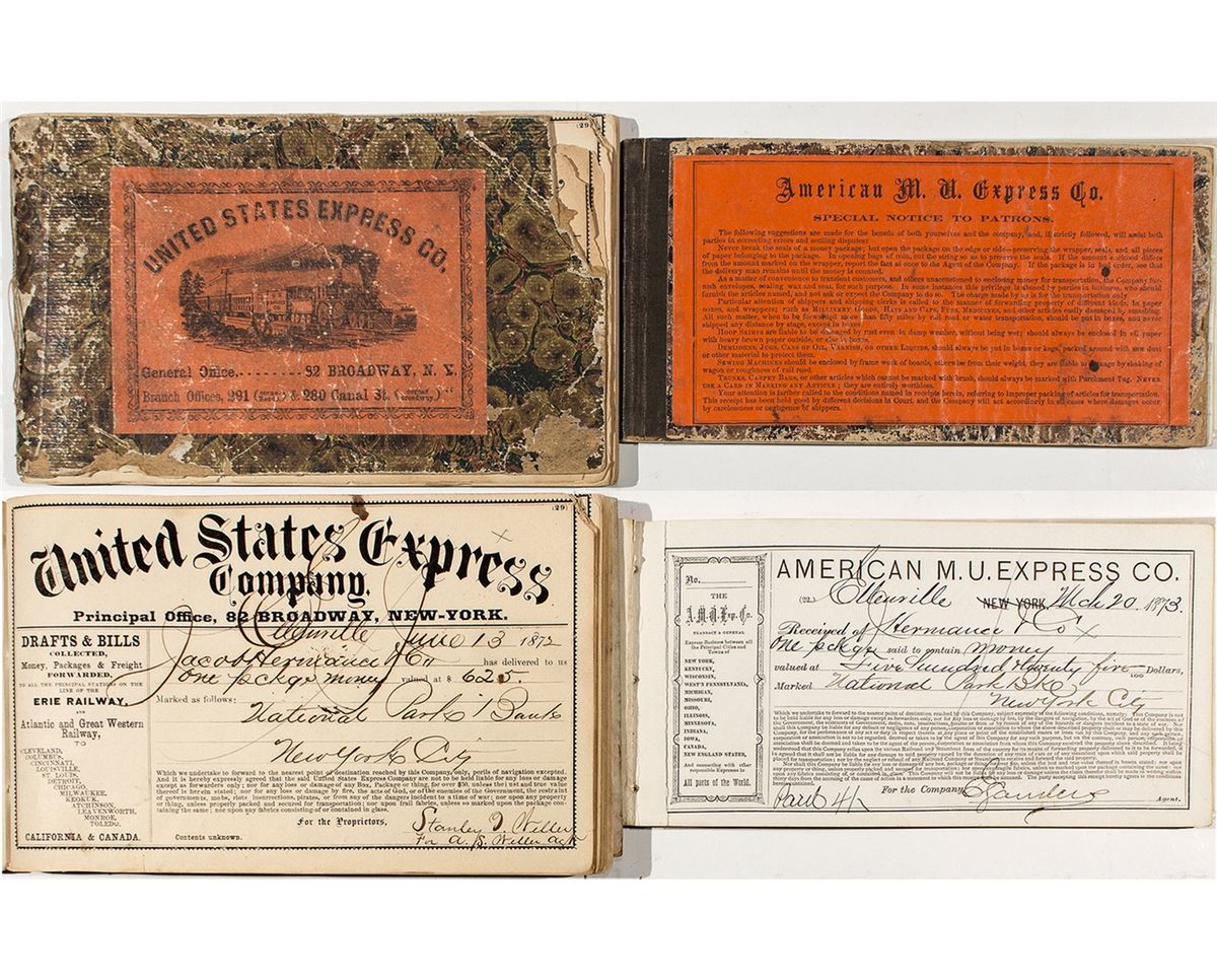 1873 Lot of 2. 1) American M. U. Express Co. book. Only the first 3 pages have been written in, the rest are blank. It is dated 1873. It measures 8.25" x 4.25" and has some wear on the cover. 2) United States Express Co. Only the first 6 pages have been written in, the rest are blank and date from 1875. It measures 8.5" x 5.30" and has wear on the cover and the first 10 pages have tears. Lynn Langdon Collection - HKA#65560