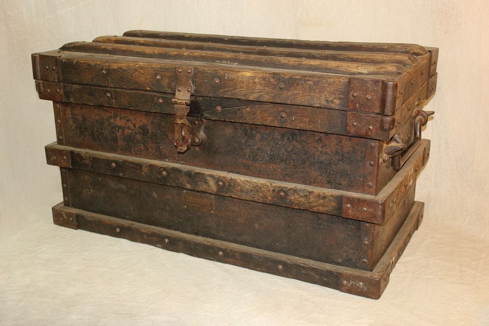 Fantastic railroad style express strong box with heavy metal clad corners, metal liner and heavy steel hasp. Measuring 32" wide.