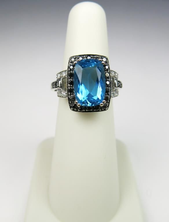 Exquisite 10 karat white gold ladies ring set with a large Swiss blue Topaz weighing approx. 7.00 carats and surrounded by 32 round white and black diamonds weighing approx. 0.30 carats. Retail $1,200-$1,800Estimate $600-$900 Nice