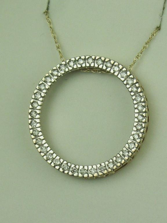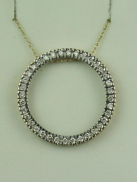 Exquisite 10 karat yellow gold ladies custom made ‘Circle of Life’ pendant pave set with over 40 round diamonds weighing approx. 0.60 carats of G-H colors and VS clarity. Retail $1,950.00 Estimate $500-$800