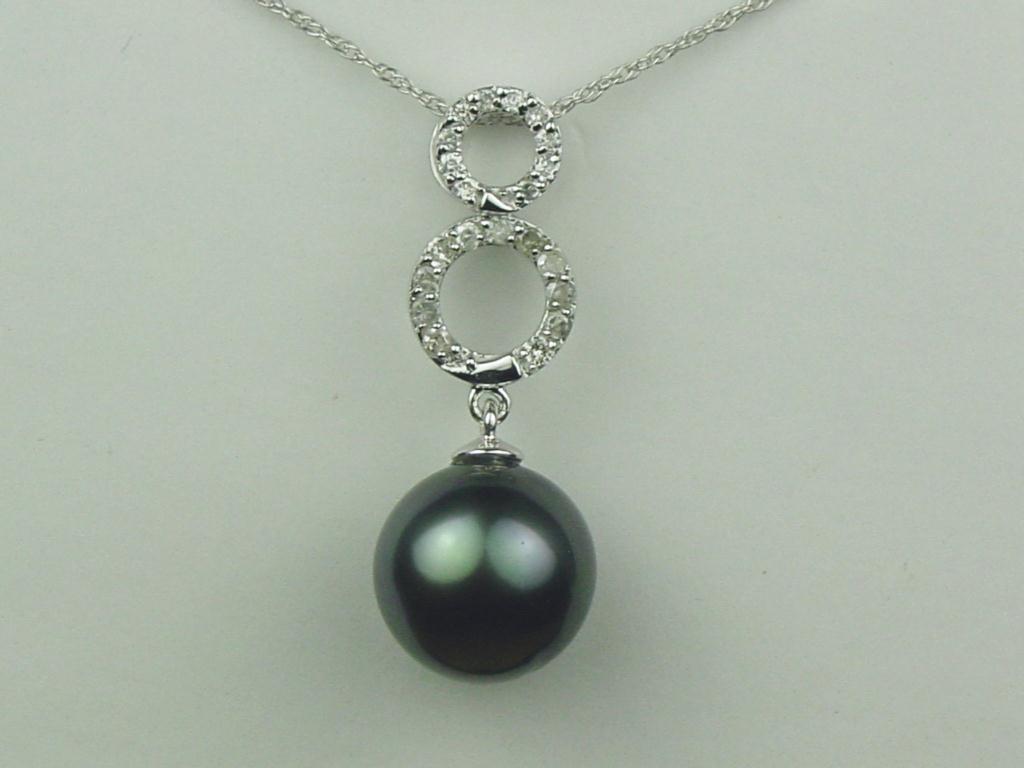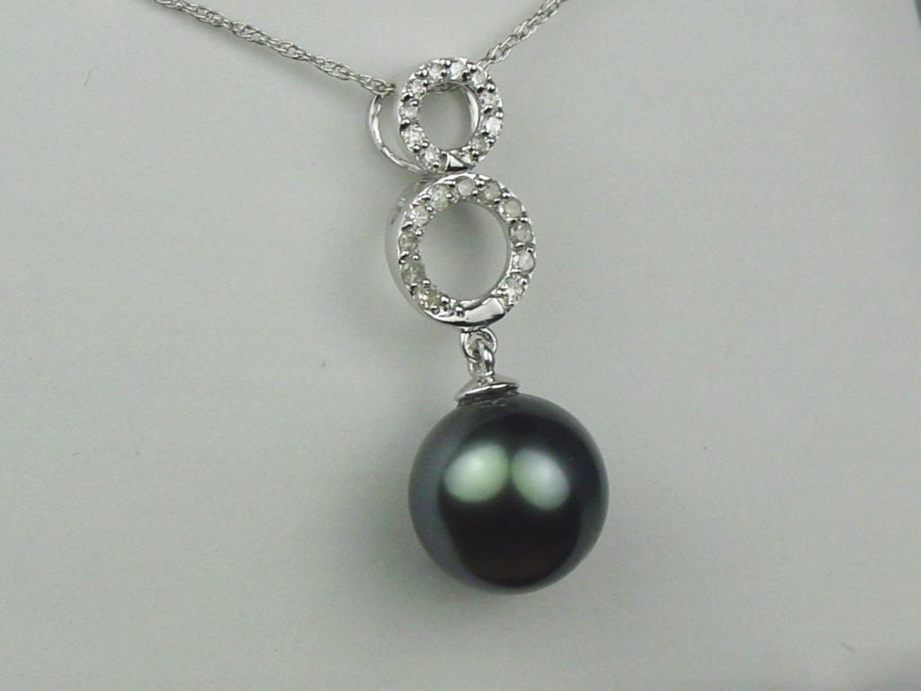 Exquisite 10K WG Ladies Designer Pendant Set with a center large round black pearl over 10.00mm in diameter and pave set with 21 round diamonds weighing approx. 0.20 carats of G-H colors and SI clarity. Retail: $1,750.00Set with a center large round black pearl over 10.00mm in diameter and pave set with 21 round diamonds weighing approx. 0.20 carats of G-H colors and SI clarity. Retail: $1,750.00