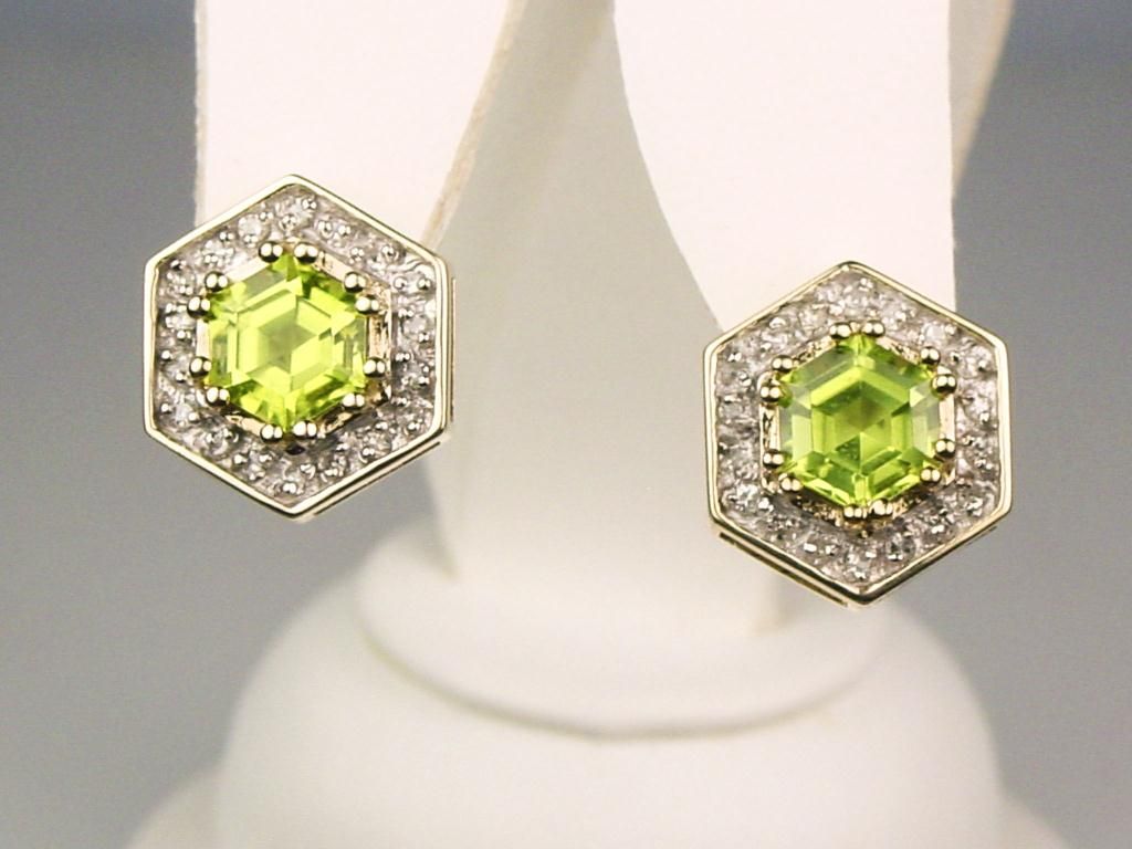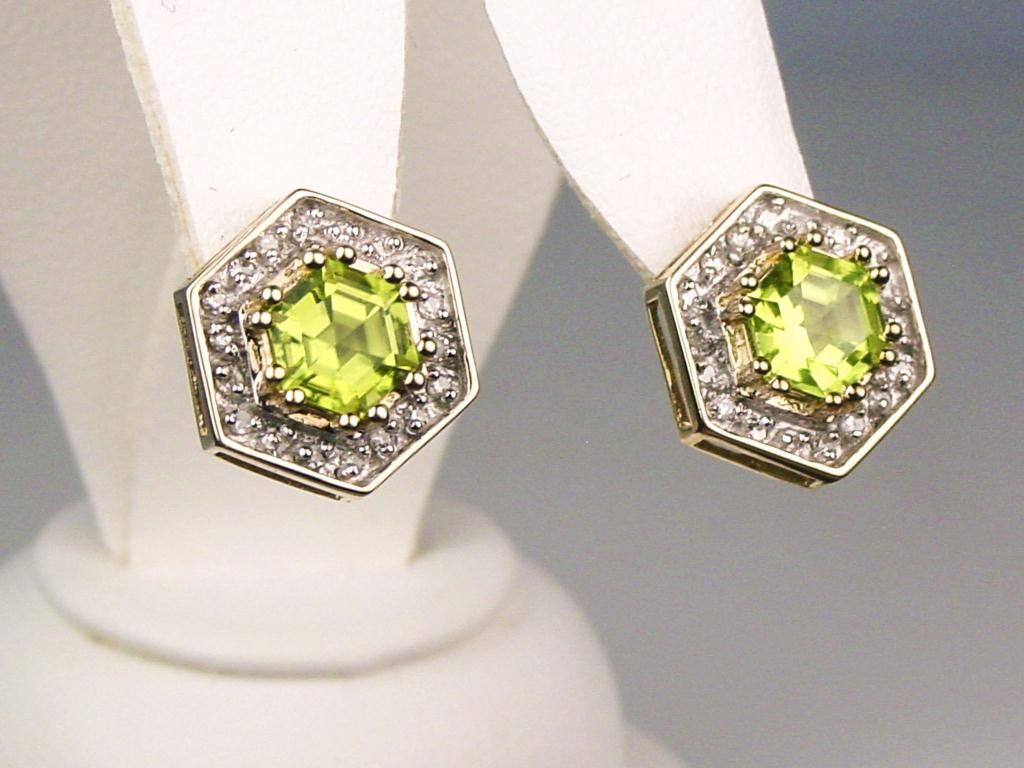 Set with 2 hexagonal cut peridot weighing approx 2.00 carats and fine set with 36 round diamonds weighing approx 0.40 carats of H-I colors and VS clarity. Retail $1,250
